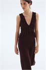 Длинное платье без рукавов из легкого трикотажа с глубоким V-образным вырезом с воланами спереди и двухслойными воланами под бюстом, переходящими на талию сзади. На подкладке.