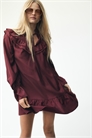 Короткое платье свободного покроя из вискозно-смесового полотна с воротником-бантом с отделкой жабо и прорезью с узкими завязками в верхней части. V-образное ярмо с двухслойной отделкой оборками спереди и сзади, длинные рукава с расклешенными манжетами и узкой резинкой вокруг запястий, а также сборчатый шов над подолом. Без отделки.