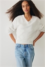 Свободный топ из легкой хлопковой ткани в виде толстовки с V-образным вырезом, спущенными плечами и длинными рукавами. Манжеты и подол отделаны лентами.