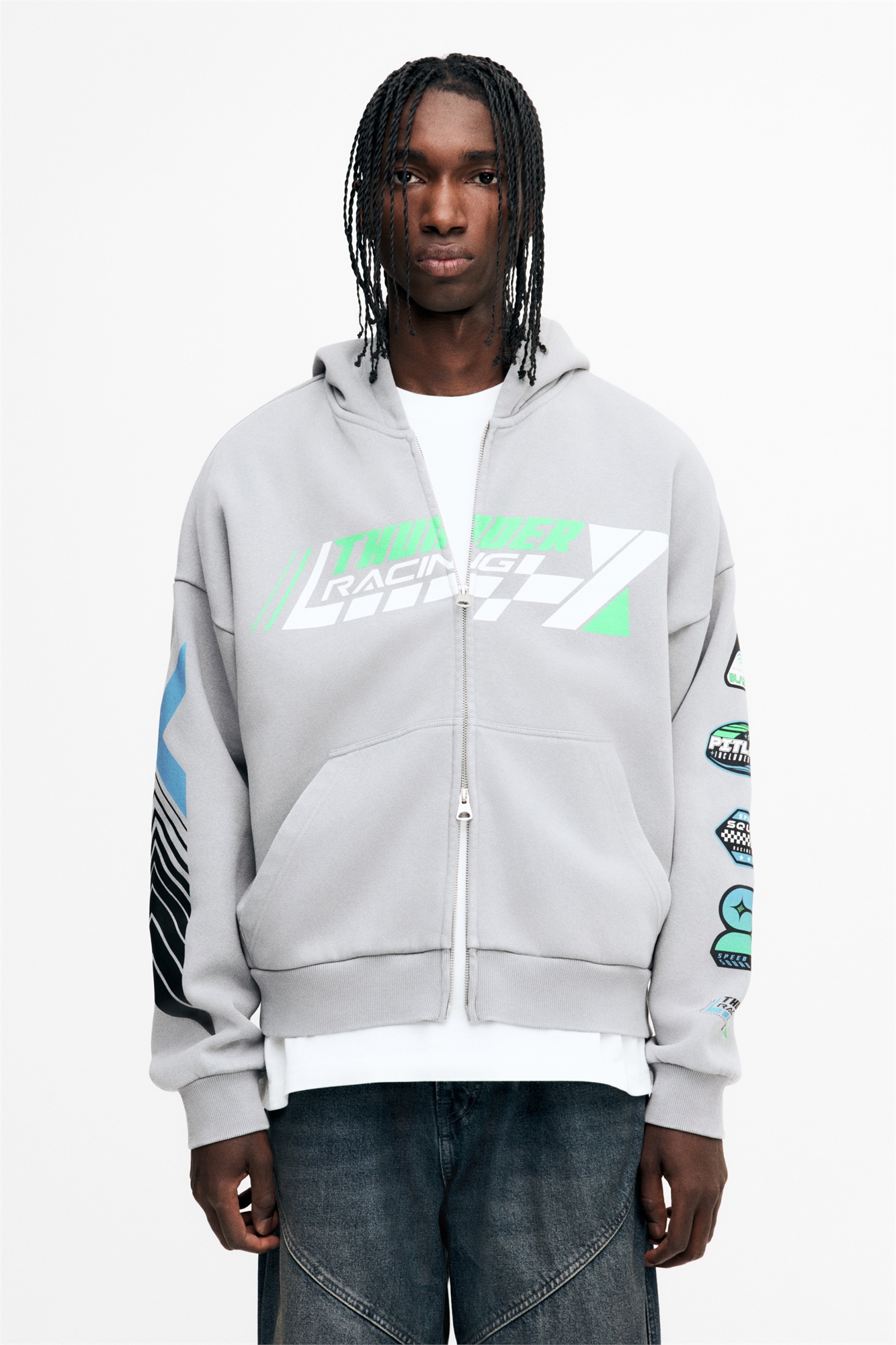 Толстовка на молнии из плотной толстовочной ткани из смеси хлопка с мягкой начесом внутри. Двухслойный капюшон, застежка-молния спереди, спущенные плечи и длинные рукава. Передние карманы и широкая ребристая отделка на манжетах и подоле. Завышенная посадка для придания мешковатого и свободного силуэта.