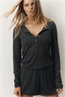 Пижама с топом и шортами из легкого трикотажа с оверлочными краями. Облегающий топ с круглым вырезом, застежкой на пуговицы и длинными рукавами. Шорты с эластичной талией.