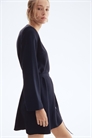 Короткое платье из тканого материала с круглым вырезом и разрезом с потайной пуговицей сзади. Накладки на плечах, длинные рукава и съемный пояс-завязка на талии. Без подкладки.