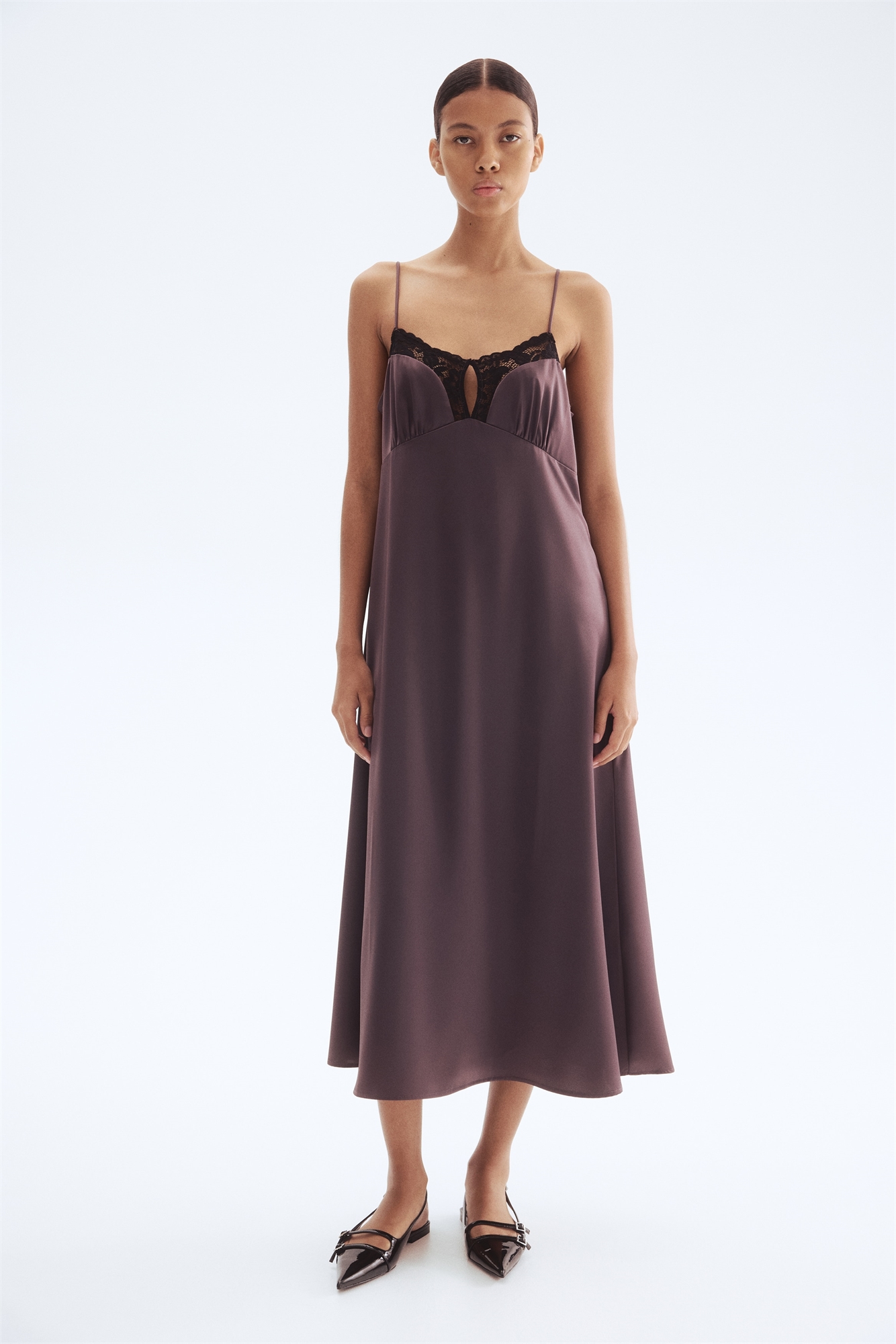 Платье длиной до щиколоток из крепового атласа с регулируемыми бретелями-спагетти и отделанным кружевом вырезом в форме сердца с замочной скважиной и потайной застежкой-крючком спереди. А-линия силуэта со сборками на чашечках и потайной застежкой-молнией с одной стороны. Без подкладки.