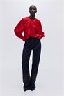 Блузка из мягко драпирующегося атласа с круглым вырезом и прорезью для ключа с пуговицей сзади. Длинные рукава реглан, перекрещивающиеся спереди, и широкие манжеты на пуговицах.