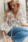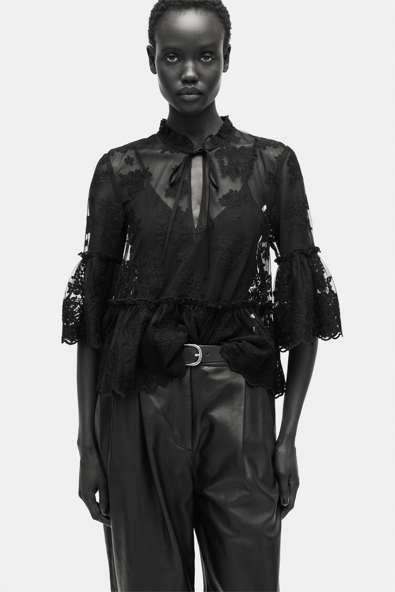 Блузка из кружева с жатым воротником и проймой с узкими завязками спереди. Рукава длиной 3/4 с оборчатыми манжетами и оборчатый подол.