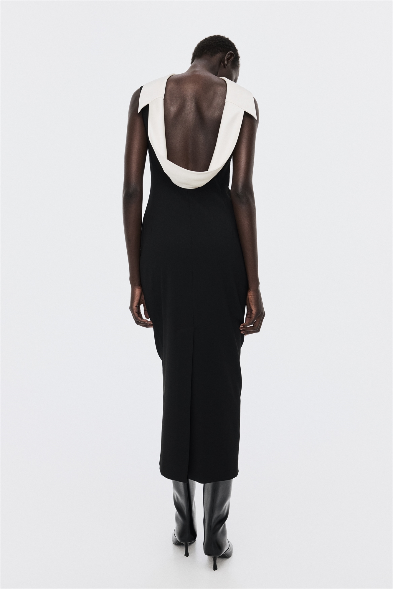 Платье-макси без рукавов из тканого материала с открытой спиной и контрастным атласным воротником, который элегантно драпируется по краям спины. Скрытая застежка-молния сбоку и прямой подол с разрезом сзади. На подкладке.