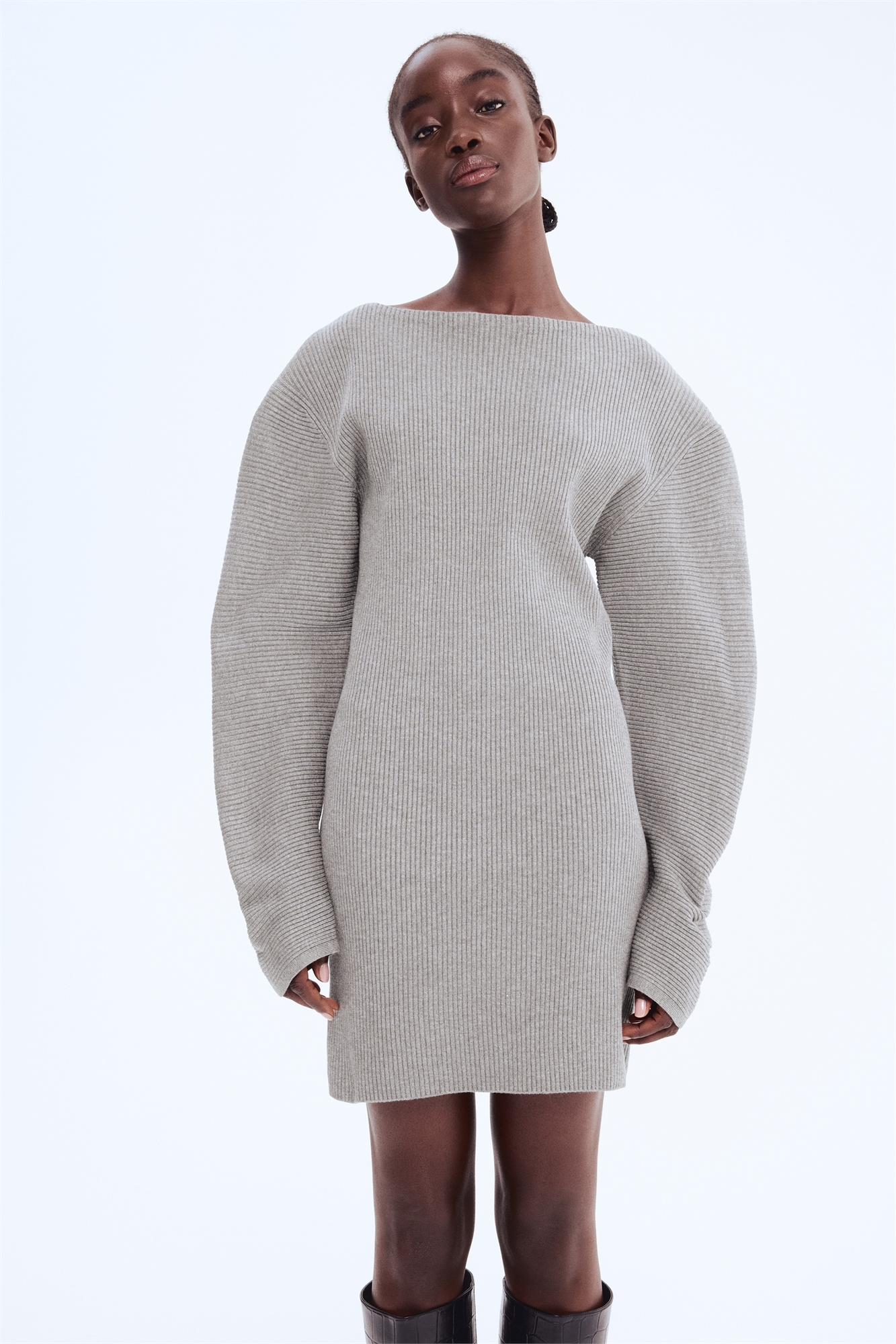 Короткое приталенное платье из мягкого трикотажа в рубчик с вырезом-лодочкой, спущенными плечами и длинными рукавами.