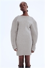 Короткое приталенное платье из мягкого трикотажа в рубчик с вырезом-лодочкой, спущенными плечами и длинными рукавами.