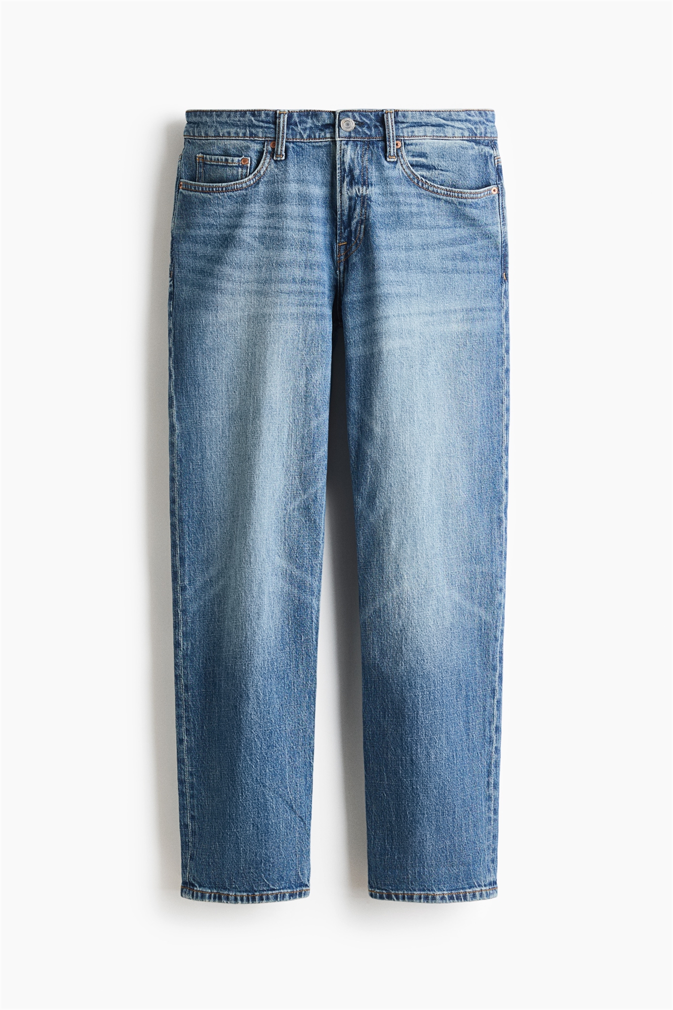 Джинсы с 5 карманами из хлопкового денима с легким стретчем для комфорта. Прямые штанины и обычная посадка от талии до подола с комфортным, более свободным покроем по всей ноге. Регулярная талия и ширинка на молнии.