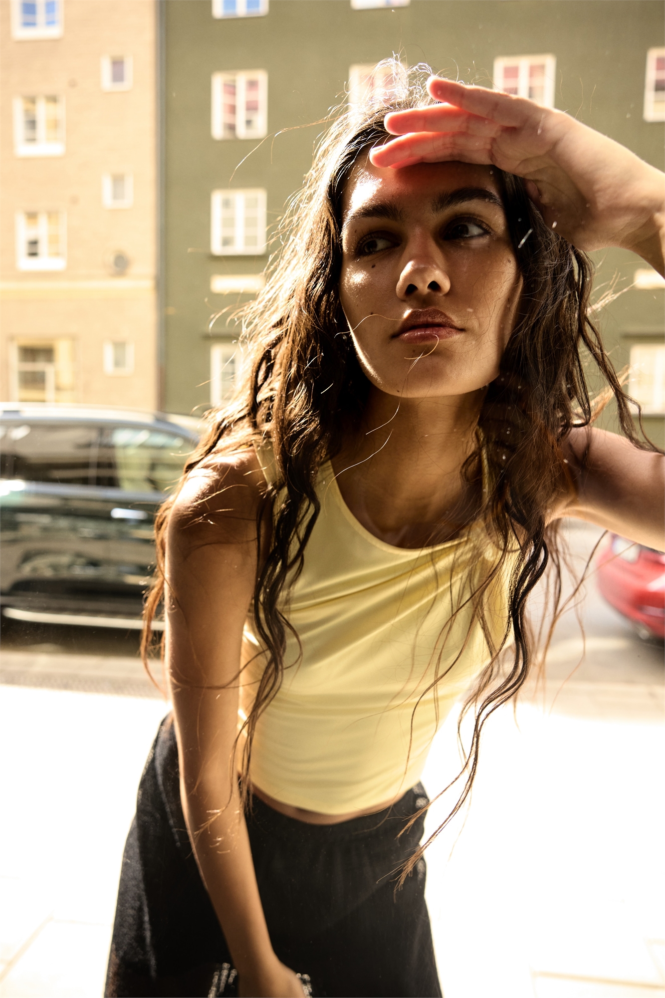 Короткий приталенный жилет из эластичного трикотажа с перекрученной деталью с одной стороны, создающей асимметричный вырез и эффект драпировки.
