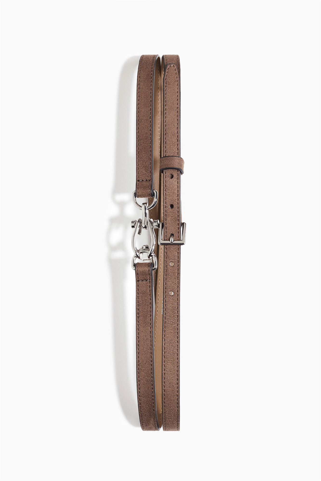 Узкий пояс с двумя ремешками из ткани с покрытием, с металлической деталью спереди и регулируемой застежкой с металлической пряжкой сзади.