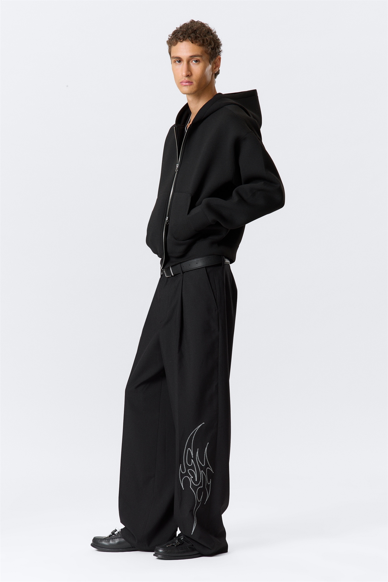 Костюмные брюки с вышивкой сшиты из переработанного полиэстера и имеют свободный, непринужденный крой. Они имеют передние складки, приталенные складки, петли для ремня и ширинку на молнии с застежкой на пуговицу. Модель дополнена косыми боковыми карманами, задним накладным карманом и вышитыми деталями на штанине.