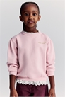 Топ из толстовки с мягкой ворсистой внутренней стороной с вышитым мотивом спереди и деталями оборок из бродери-англиз. Круглый вырез с ребристой отделкой и отверстие для ключа с пуговицей сзади. Спущенные плечи, длинные рукава-баллоны и окантовка манжет и подола.