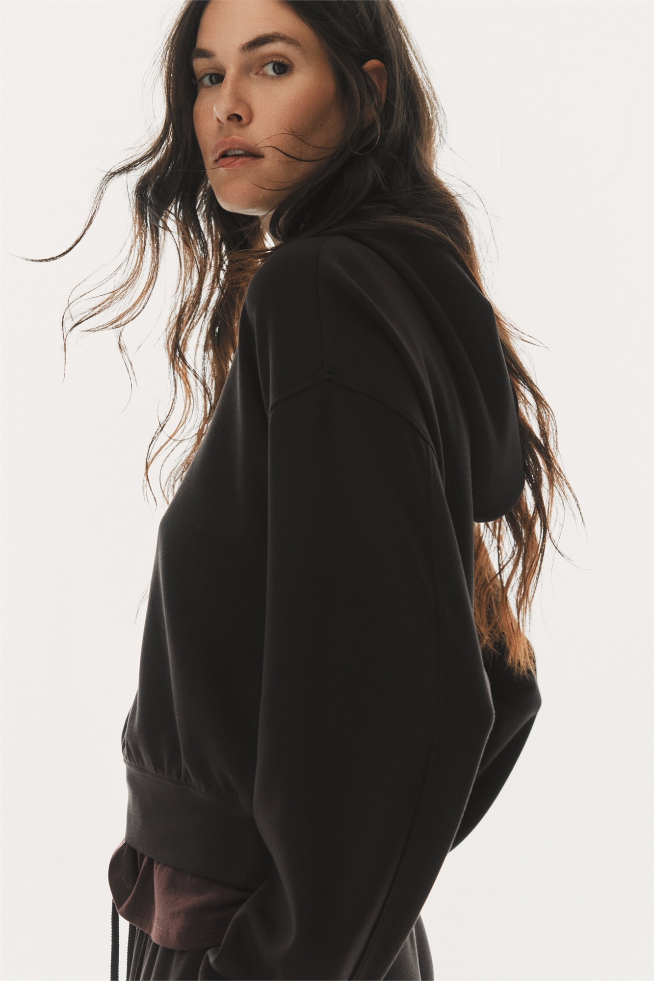 Топ из супермягкого трикотажа с двухслойным капюшоном, спущенными плечами и длинными рукавами. Манжеты и подол отделаны ребрами жесткости.