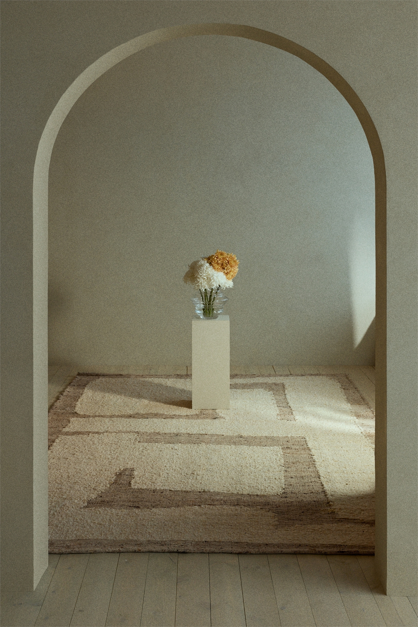 Плетеный ковер из шерстяной смеси, изготовленный из неокрашенной пряжи ручного прядения. На нем изображен абстрактный мотив. Обратите внимание, что новые ковры иногда имеют слабый запах, который можно легко удалить, проветрив и пропылесосив.