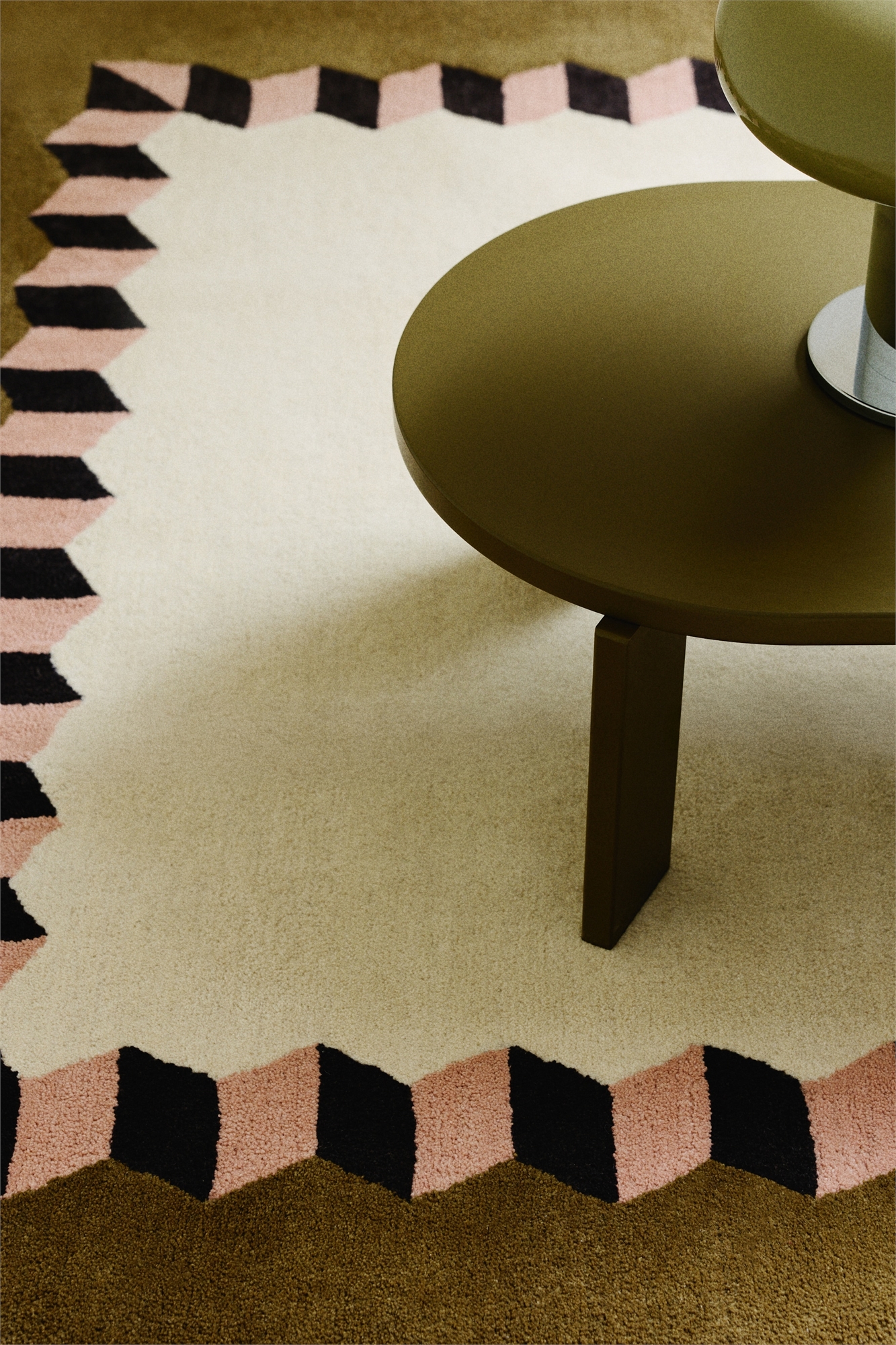 Ковер из ворсистой шерсти с графическим узором в нейтральных тонах. Обратите внимание, что новые ковры иногда имеют слабый запах, который можно легко удалить, проветрив и пропылесосив.