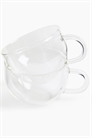 Набор из двух стеклянных кружек с ручкой. Изготовлены из прочного боросиликатного стекла, идеально подходят для подачи горячих вкусных напитков. Штабелируемая конструкция поможет сэкономить место на полке на вашей кухне. Объем 350 мл.