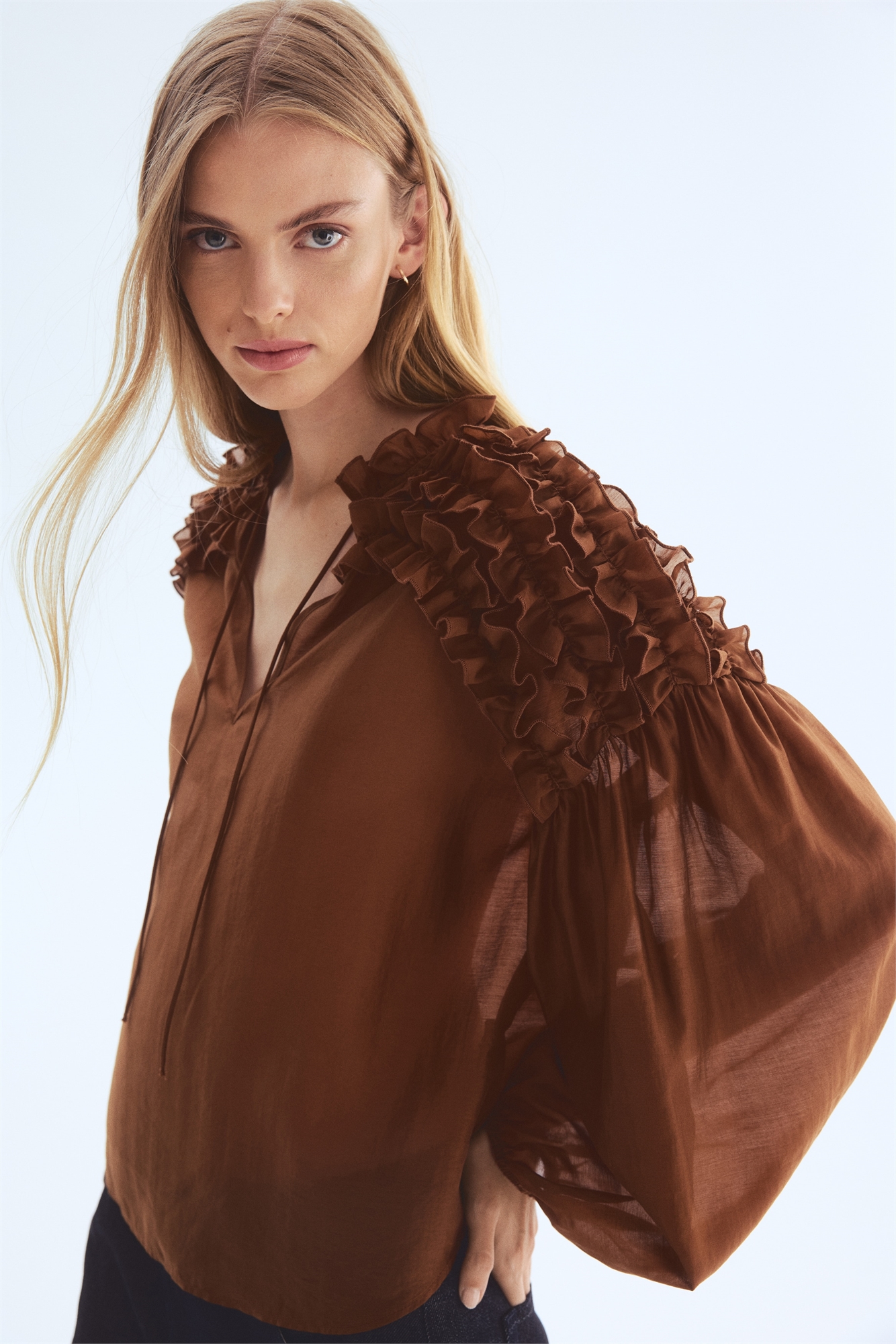 Блузка из лиоцеллового микса с легким блеском. Воротник с оборками и многочисленные оборки на плечах. V-образная пройма с узкими завязками спереди и длинные рукава-баллоны с узкой резинкой на манжетах.