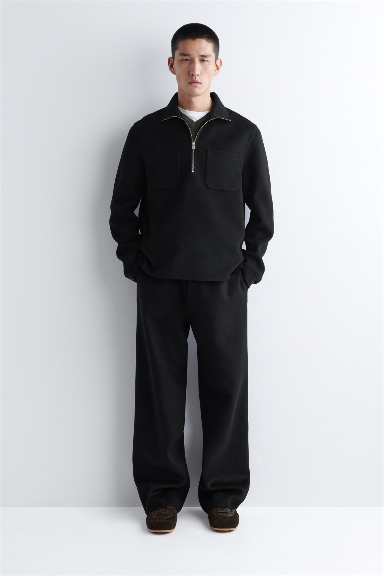 Переосмысление классического пошива: эти изысканные брюки сшиты из мягкой шерстяной смеси RWS с двойной лицевой отделкой. Они имеют непринужденный покрой с прямыми ногами и выполнены в строгом черном цвете. Свободный кройЗастежка на крючок, планку и молниюЭто изделие содержит шерстяное волокно Responsible Wool Standard TE-00047206 (RWS) с ферм, сертифицированных в соответствии с требованиями к благополучию животных и землепользованию Материал: 60% шерсть RWS, 40% TENCEL™ Lyocell. Подкладка карманов: 100% хлопок. Без учета отделки / Сухая чистка Внутренняя длина штанины размера EU 48 составляет 75,6 см / Модель носит размер EU 48