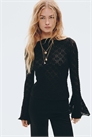Облегающий топ из кружевного джерси с нежным вырезом-лодочкой, длинными рукавами-трубами и прямым покроем подола.