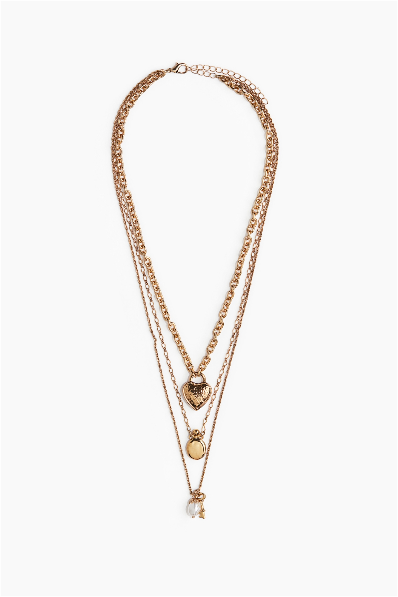 Многослойное ожерелье из трех металлических цепочек разного дизайна, каждая с подвеской. Регулируемая длина с застежкой-пусковым механизмом.