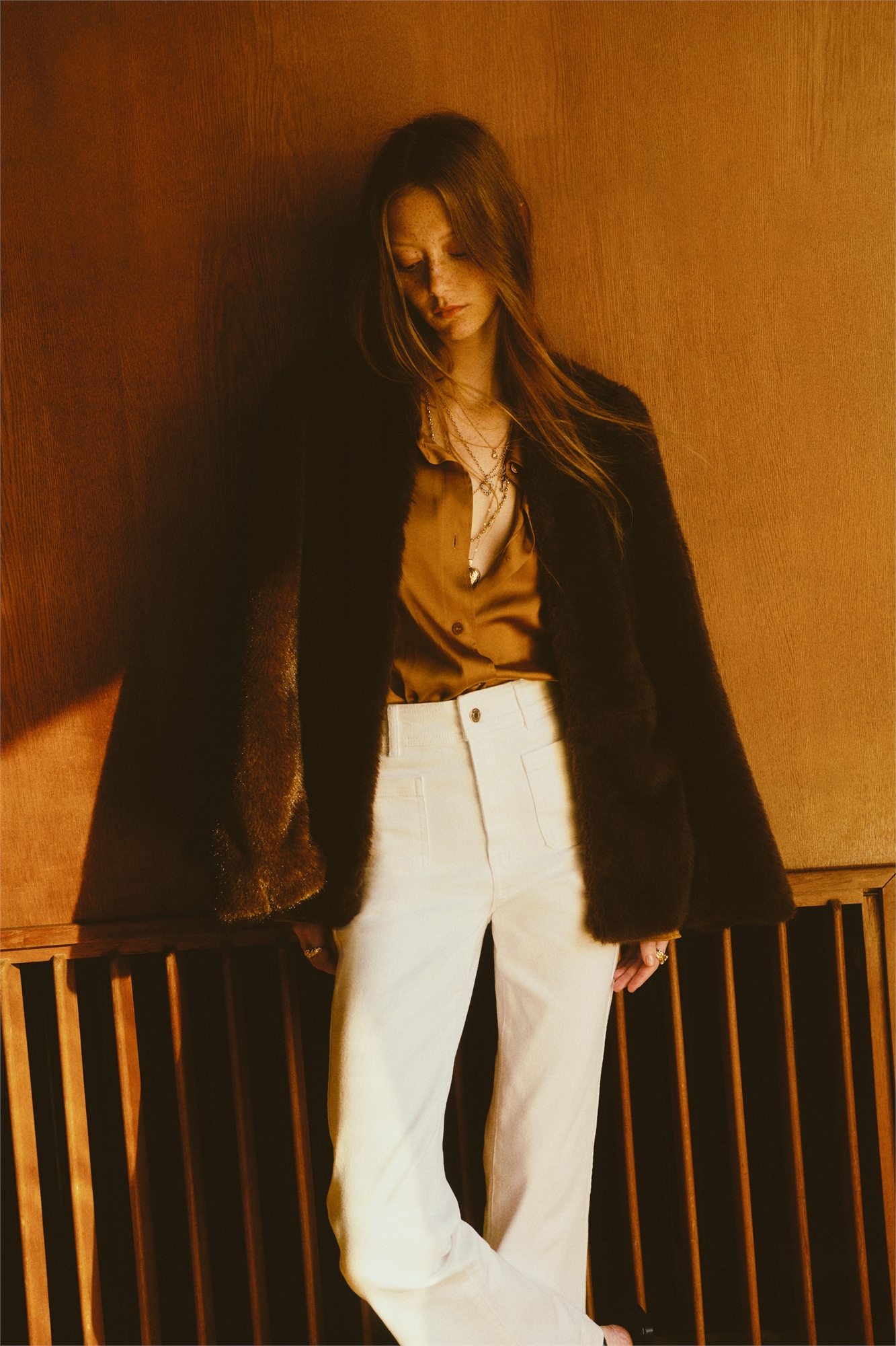 Джинсы из хлопкового денима с легким стретчем для комфорта. Расклешенные штанины с зауженной посадкой от талии до бедра и расклешенным кроем от колена до подола. Высокая талия, ширинка на молнии и пуговице. Накладные карманы спереди и сзади. Регулярная длина, рассчитанная на то, чтобы доходить до верхней части стопы с минимальной или нулевой стопой. Определяющая форма из сезона в сезон.