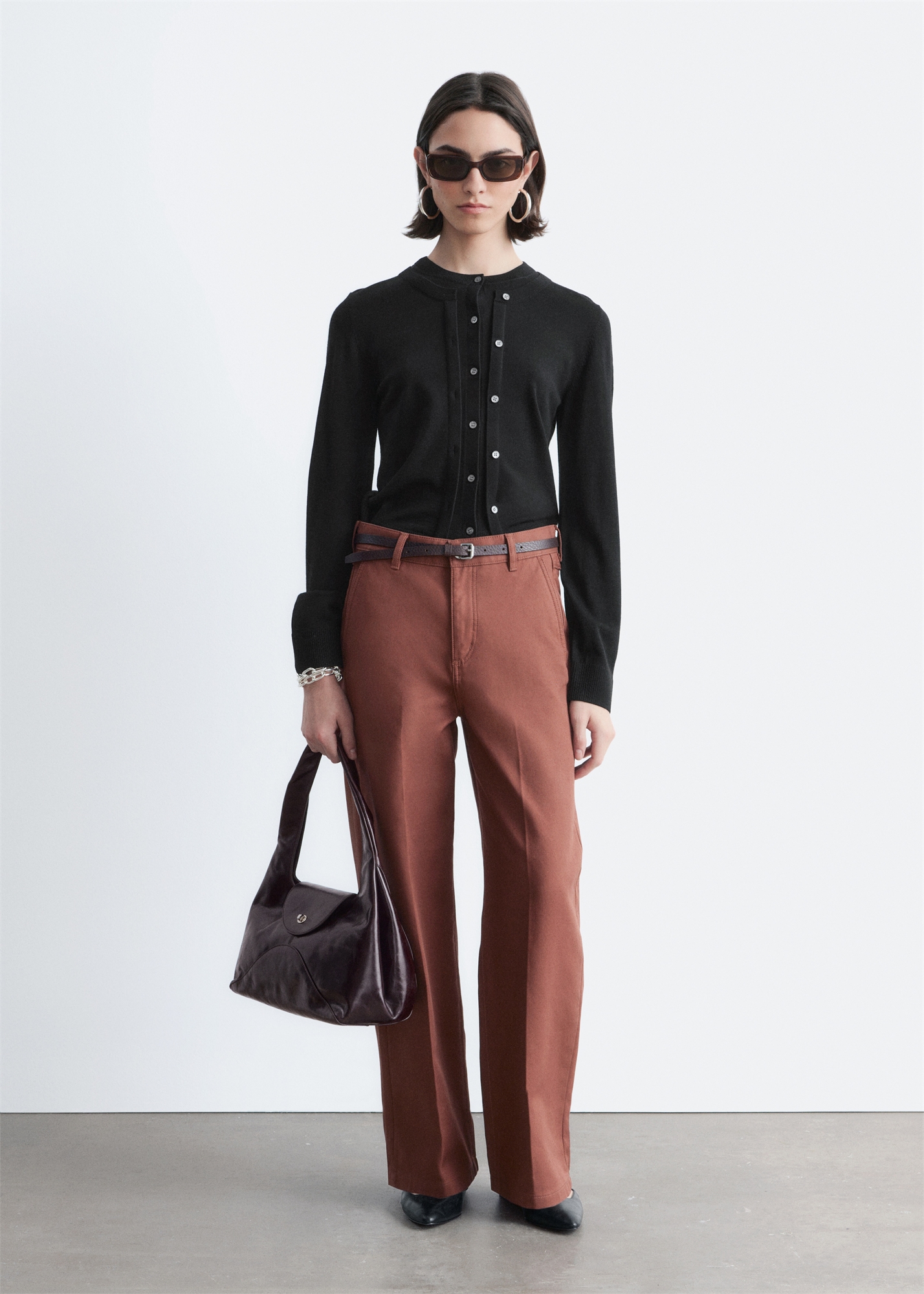 Эти брюки из плотного хлопка имеют свободный крой с длинными широкими брючинами. Отделанные простроченными швами и застежкой-молнией спереди с пуговицей. Шлевки для ремня.