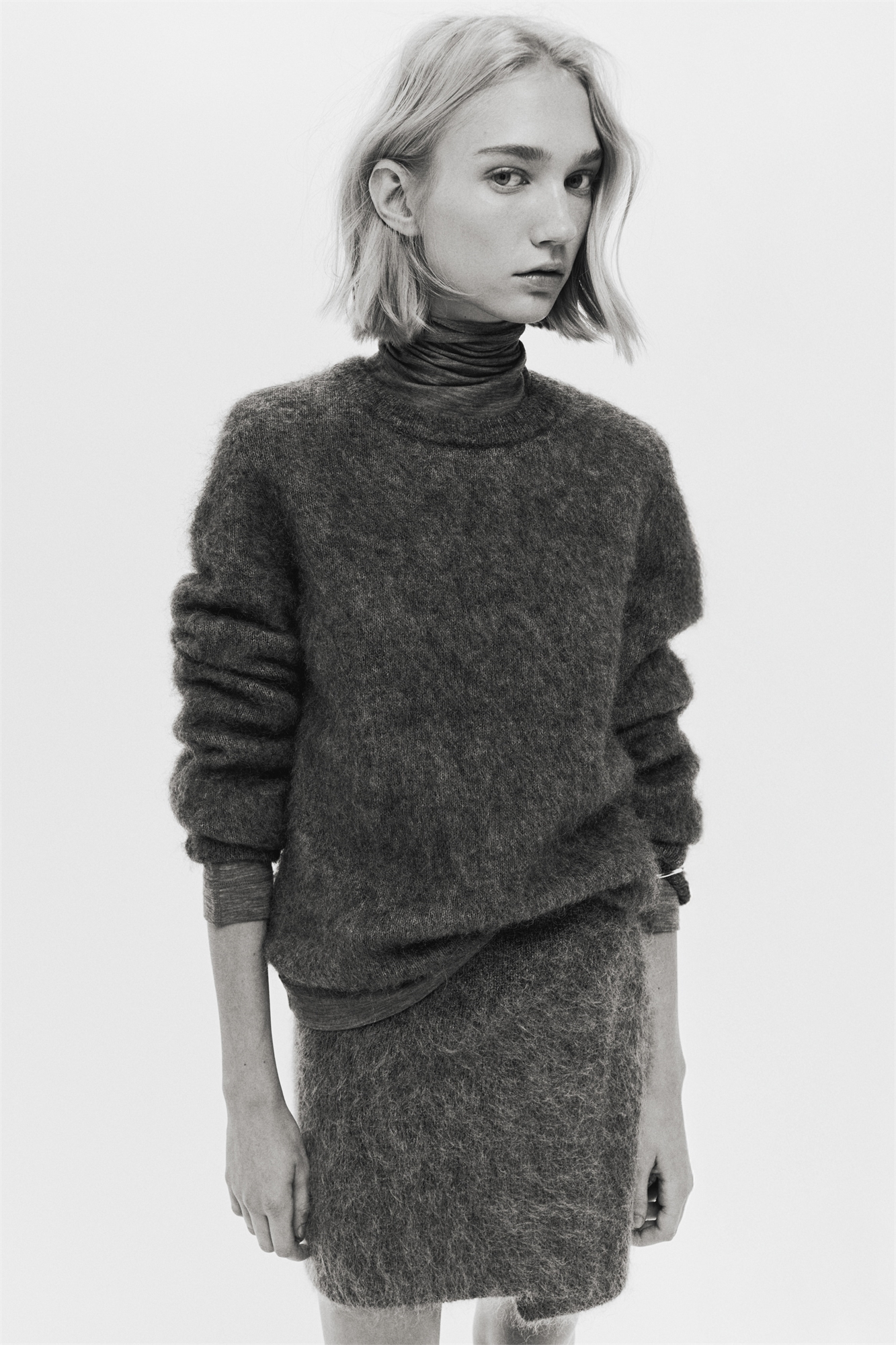 Облегающая юбка-мини из мягкого трикотажа с мохером и шерстью. Высокая талия и отложной воротник с пуговицей в верхней части.