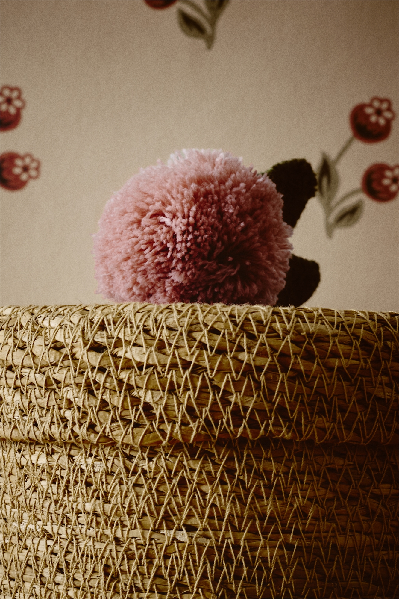 Небольшая круглая коробка для хранения из плетеного морского тростника с крышкой, украшенной забавным помпоном.