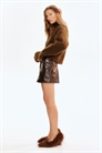 Короткий кардиган свободного покроя из мягкого трикотажа с содержанием мохера и шерсти. Ребристый воротник-стойка, двусторонняя застежка-молния спереди и спущенные плечи с соединенными швами спереди и сзади, создающими вид "седла". Ребристые манжеты и подол.