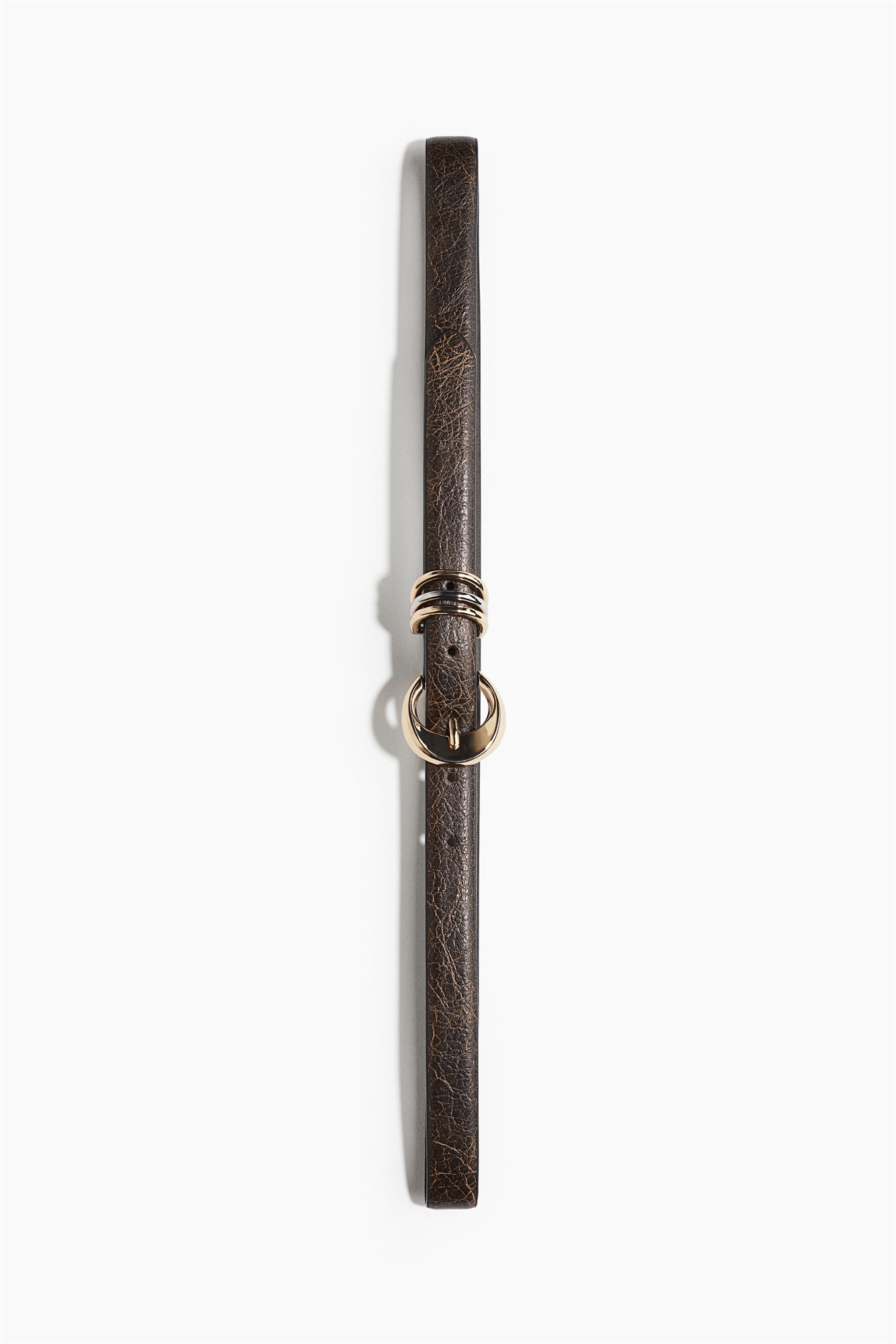 Ремень из ткани с покрытием и круглой металлической пряжкой.