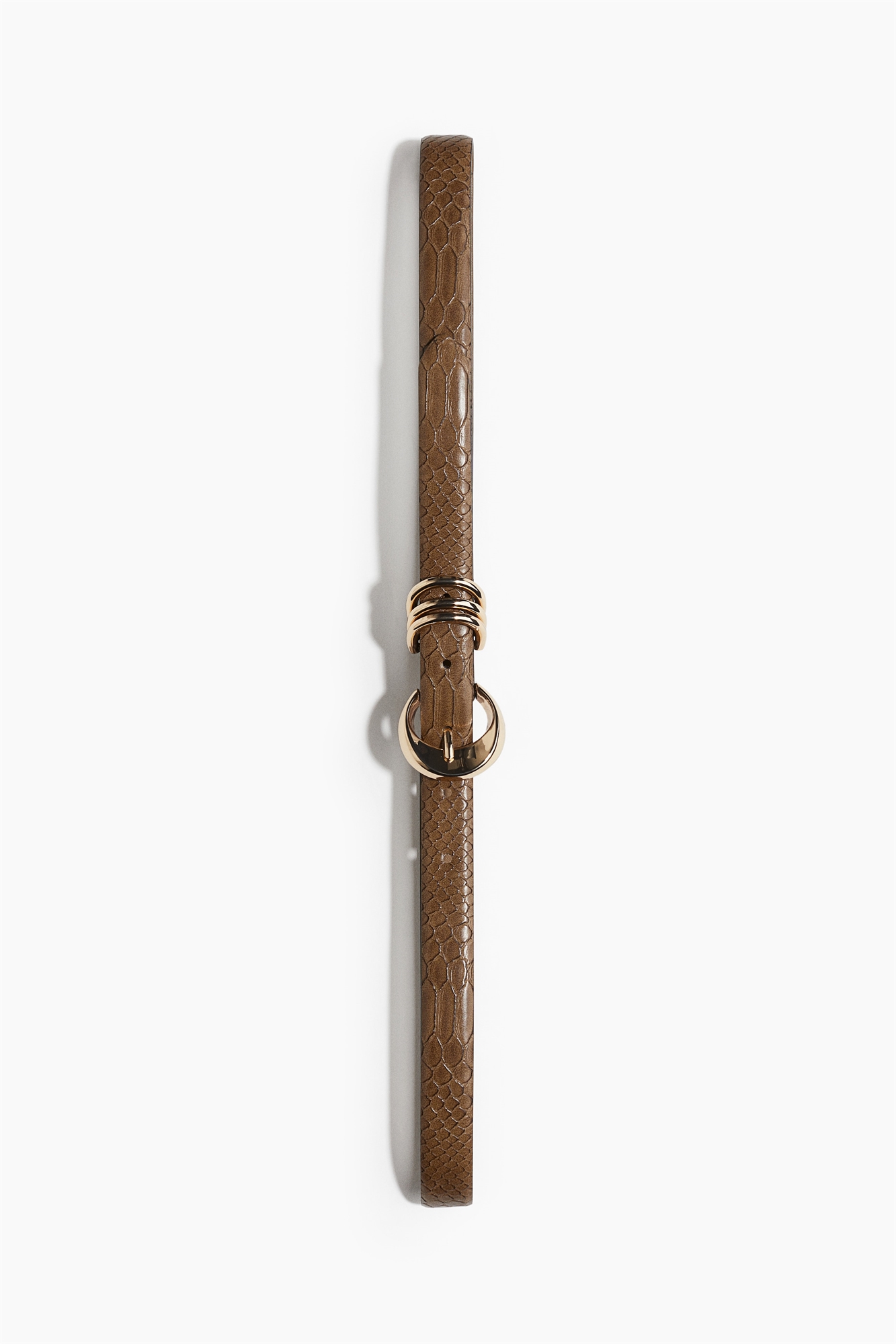 Ремень из ткани с покрытием и круглой металлической пряжкой.