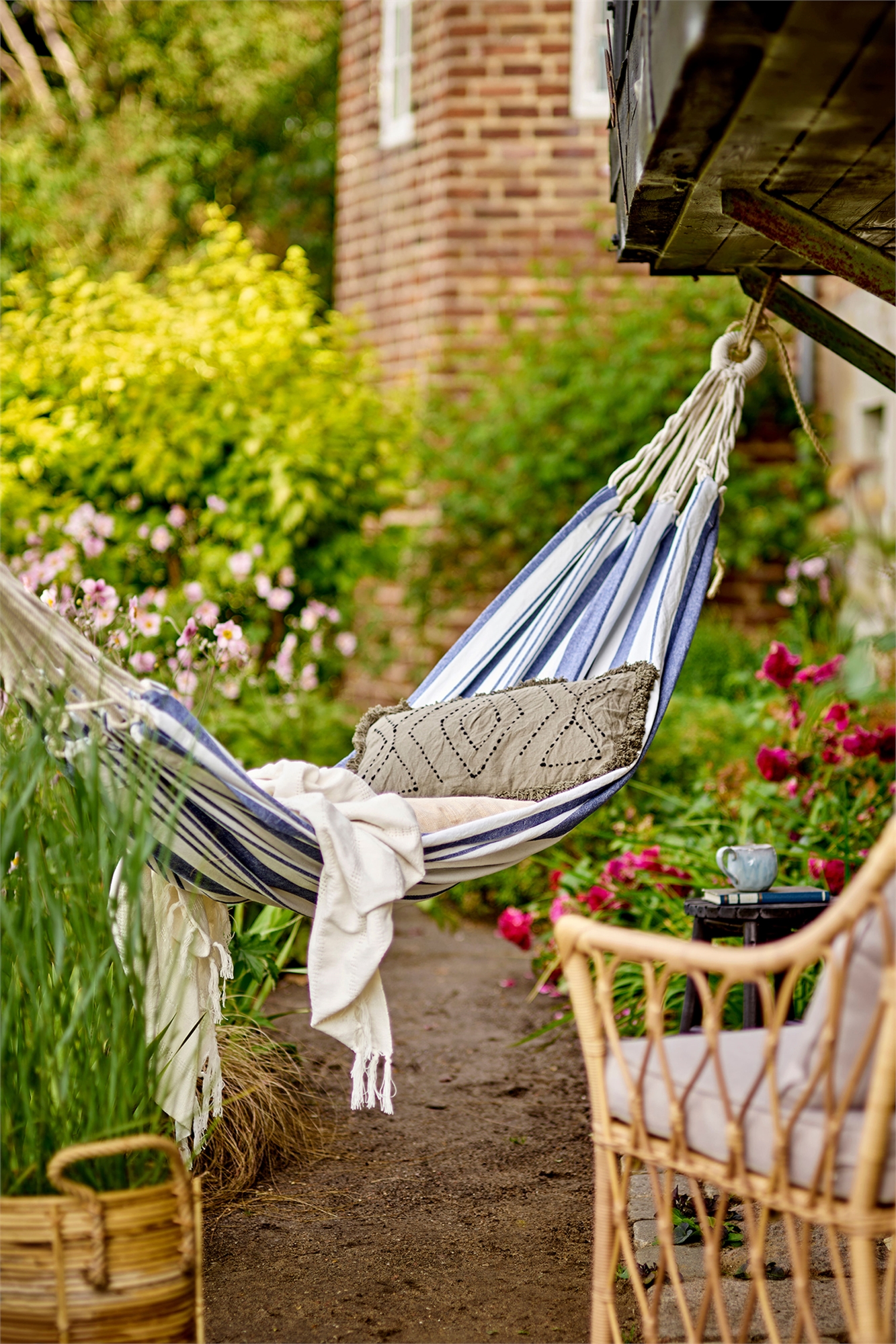 Гамак Remo от Bloomingville изготовлен из высококачественного хлопка с элегантными полосками, которые добавят стильный акцент вашей открытой площадке. Гамак оснащен металлическими кольцами, которые укрепляют веревку и обеспечивают ее устойчивое и надежное подвешивание. Идеально подходит для отдыха в летний зной или в качестве декоративного элемента в саду. L300(200)xW100 см.