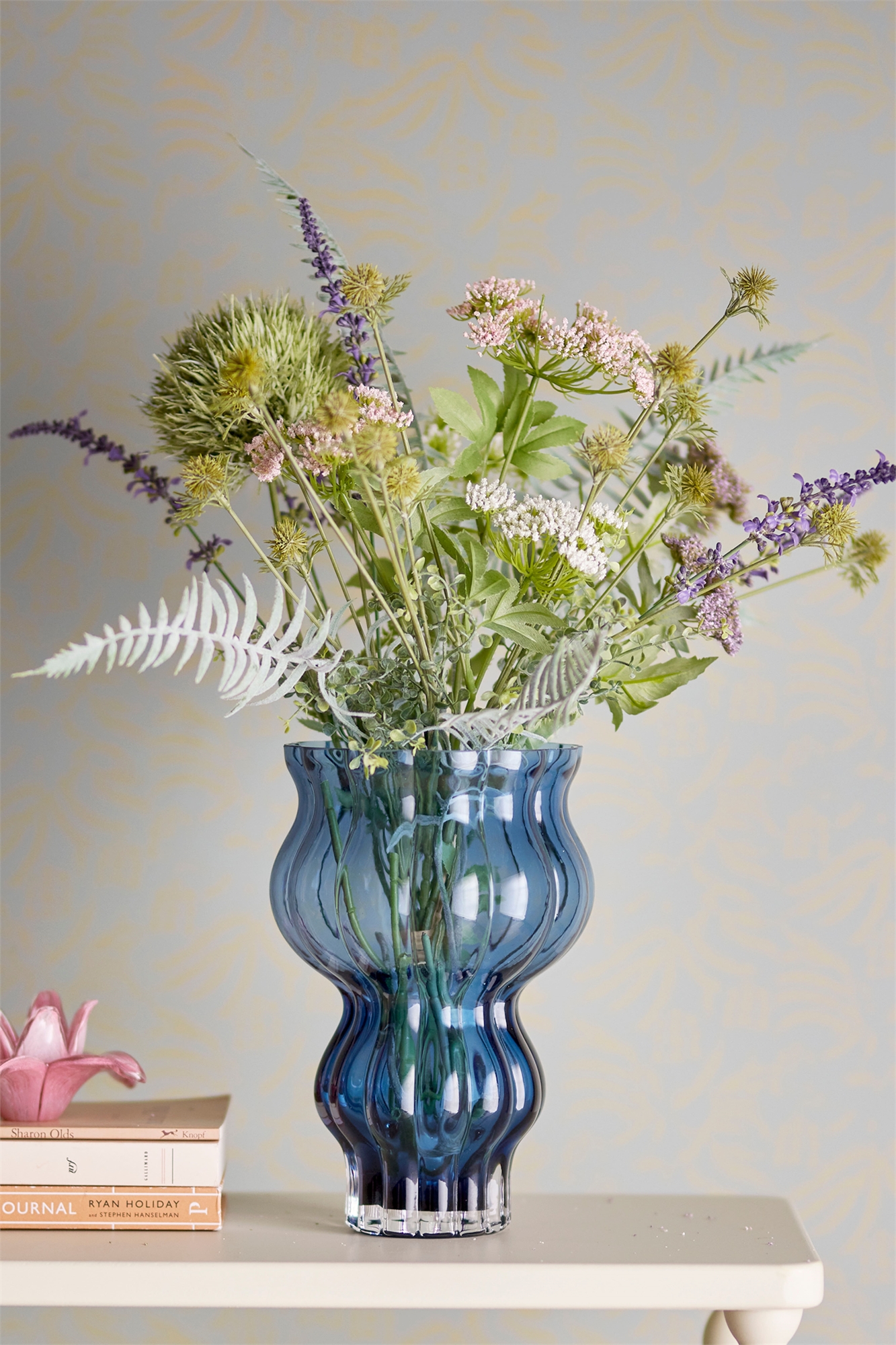 Ваза Zanna от Bloomingville выполнена из стекла красивого синего цвета. Ваза имеет форму, подчеркнутую множеством мелких деталей. Она идеально подходит для преподнесения красивого букета цветов или как самостоятельная декоративная деталь. D17,5xH26 см.