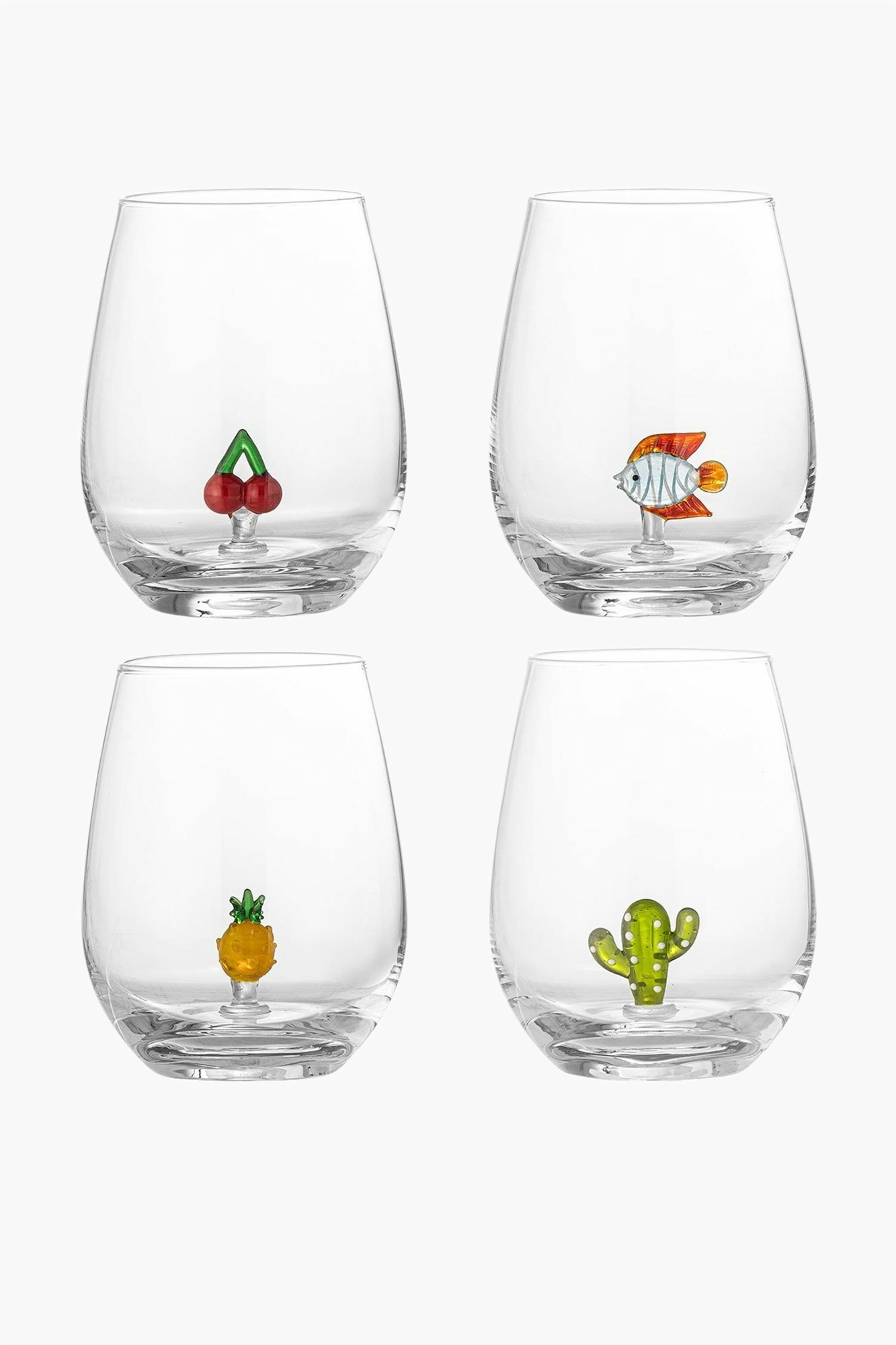 Бокалы для питья Misa от Bloomingville - это набор из четырех красиво оформленных бокалов, каждый из которых украшен уникальной фигуркой ручной работы на дне. Фигурки рыбки, ананаса, кактуса и вишни придают игривый и индивидуальный характер каждой порции. Детали ручной работы делают каждый бокал уникальным. Ø9xH12 см, набор из 4 штук.