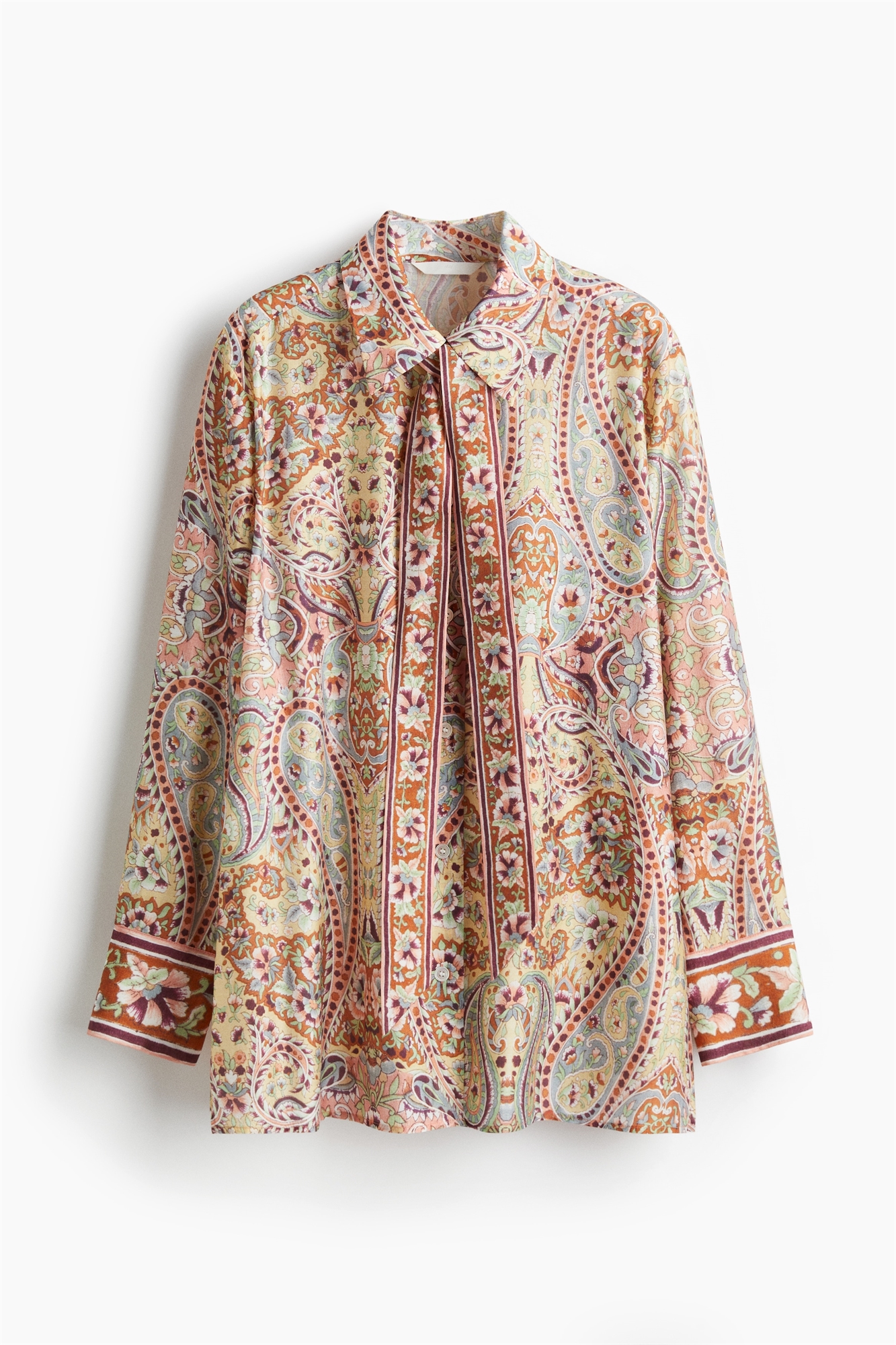 Рубашка больших размеров из тканого материала с воротником и съемным ремешком, завязывающимся на шее спереди. Пуговицы спереди, слегка спущенные плечи и длинные рукава с манжетами на пуговицах. Подол прямого покроя с разрезом с каждой стороны.