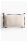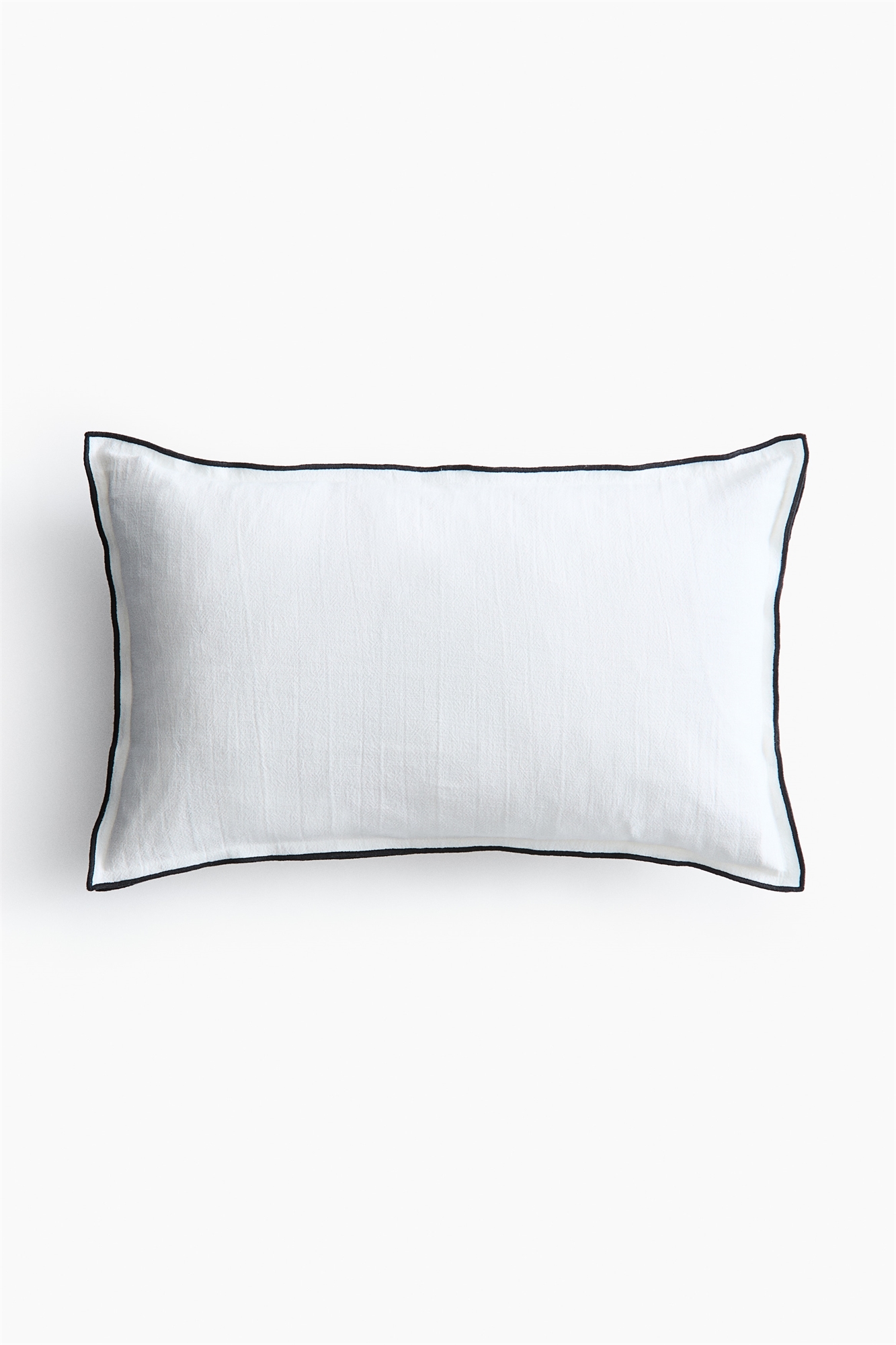 Прямоугольная наволочка из холста, изготовленная из смеси льна и хлопка. Имеет двухслойную окантовку с оверлочными краями контрастного цвета. Скрытая молния сзади.
