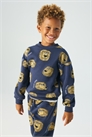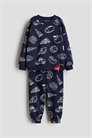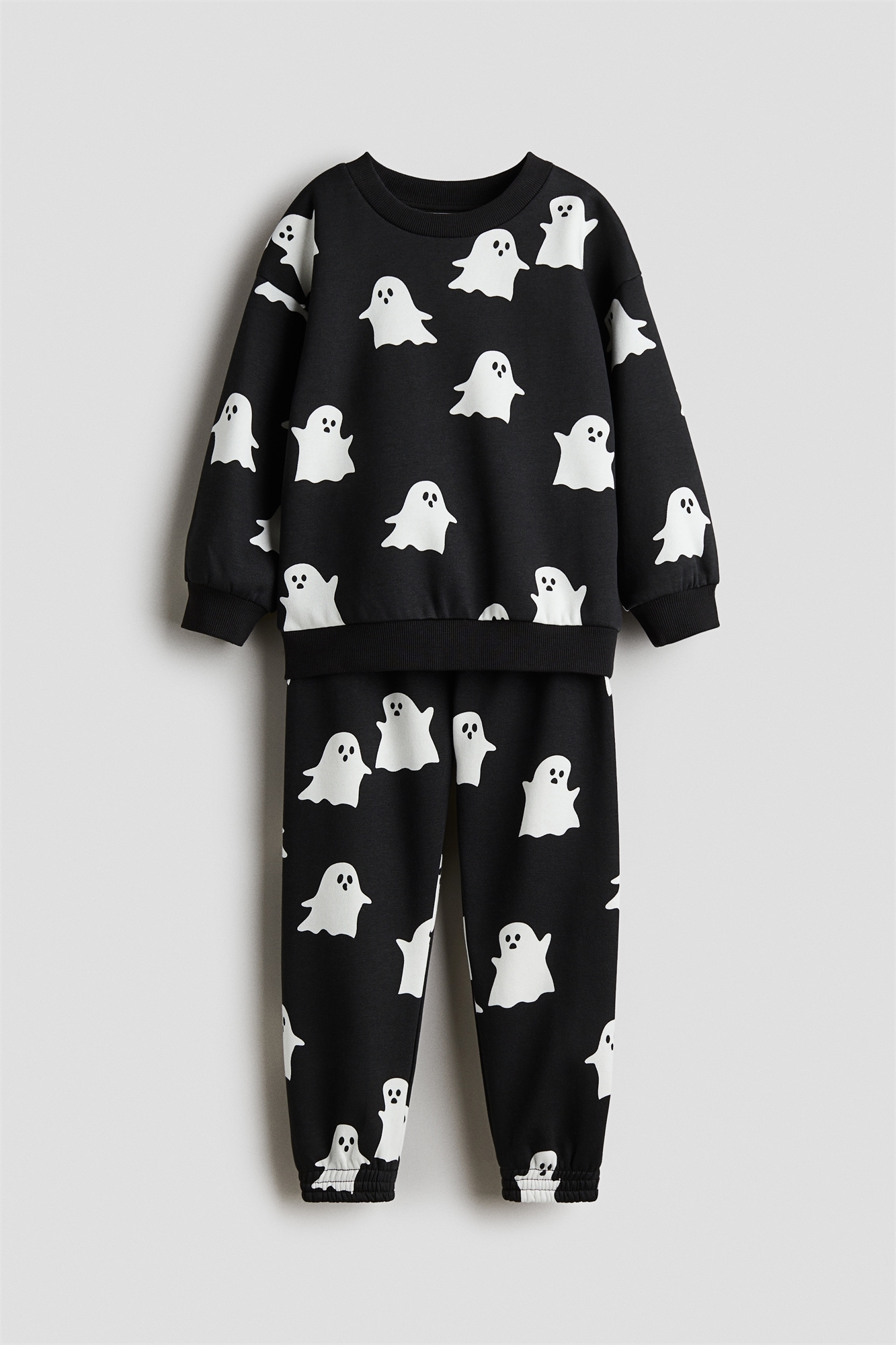 Комплект из топа и джоггеров из легкого толстовочного материала с мягкой ворсистой внутренней стороной и принтом на всю длину. Топ с круглым вырезом в рубчик, спущенными плечами и длинными рукавами. Манжеты и подол отделаны ребрами жесткости. Джоггеры с эластичным утягивающим поясом и эластичными вставками на подоле.
