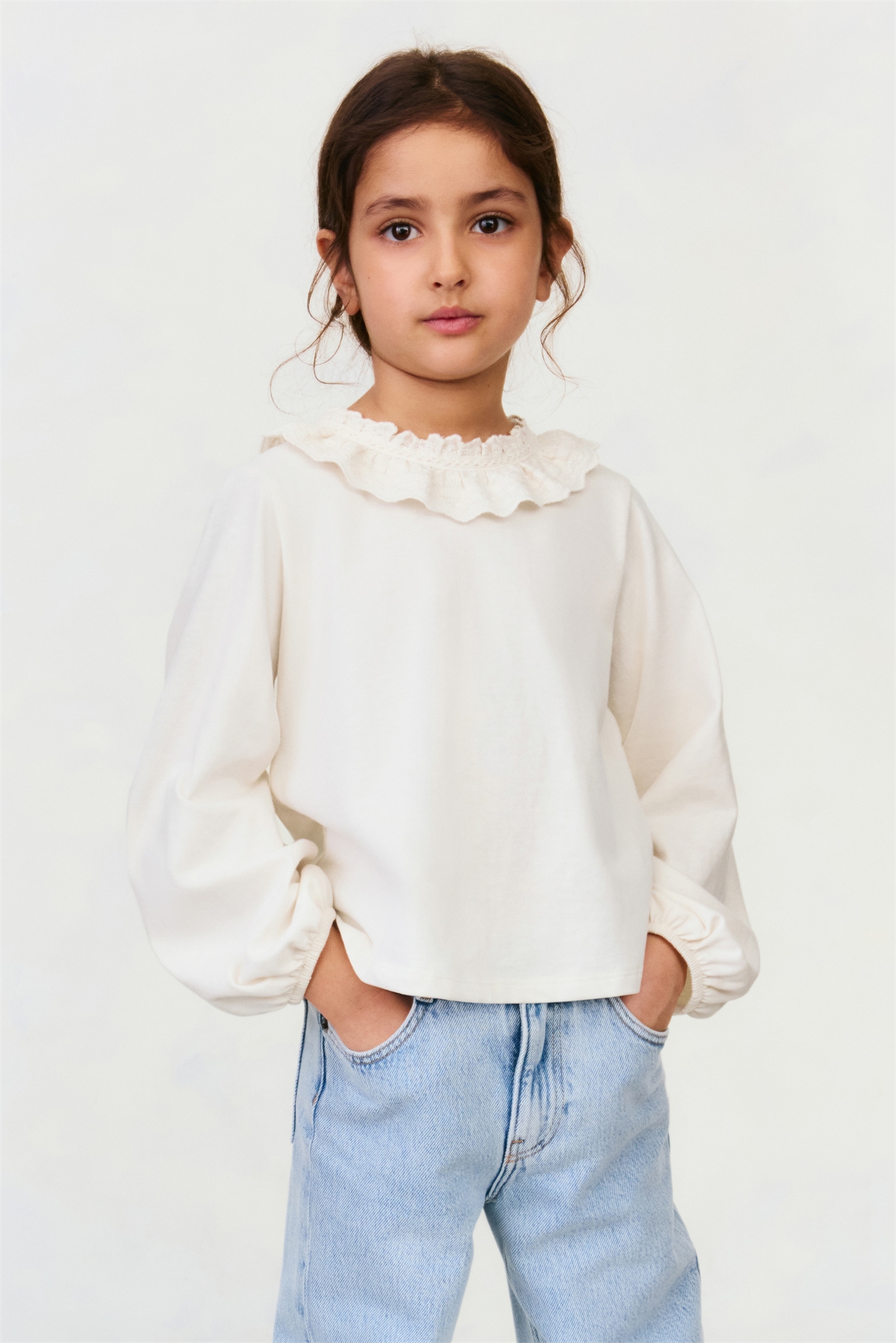 Блузка из мягкого джерси, изготовленная из высококачественного хлопка, с воротником-стоечкой из мягкого переплетения с бродери-англиз и оборкой по вырезу горловины. Застежка на пуговицы сзади и длинные пышные рукава с узкими эластичными манжетами. Наш хлопковый трикотаж имеет высокий показатель GSM, что означает более плотное и прочное качество без ущерба для комфорта. Коллекция H&M Adorables - это подборка качественных вещей с высоким уровнем комфорта, которые не подвластны времени.