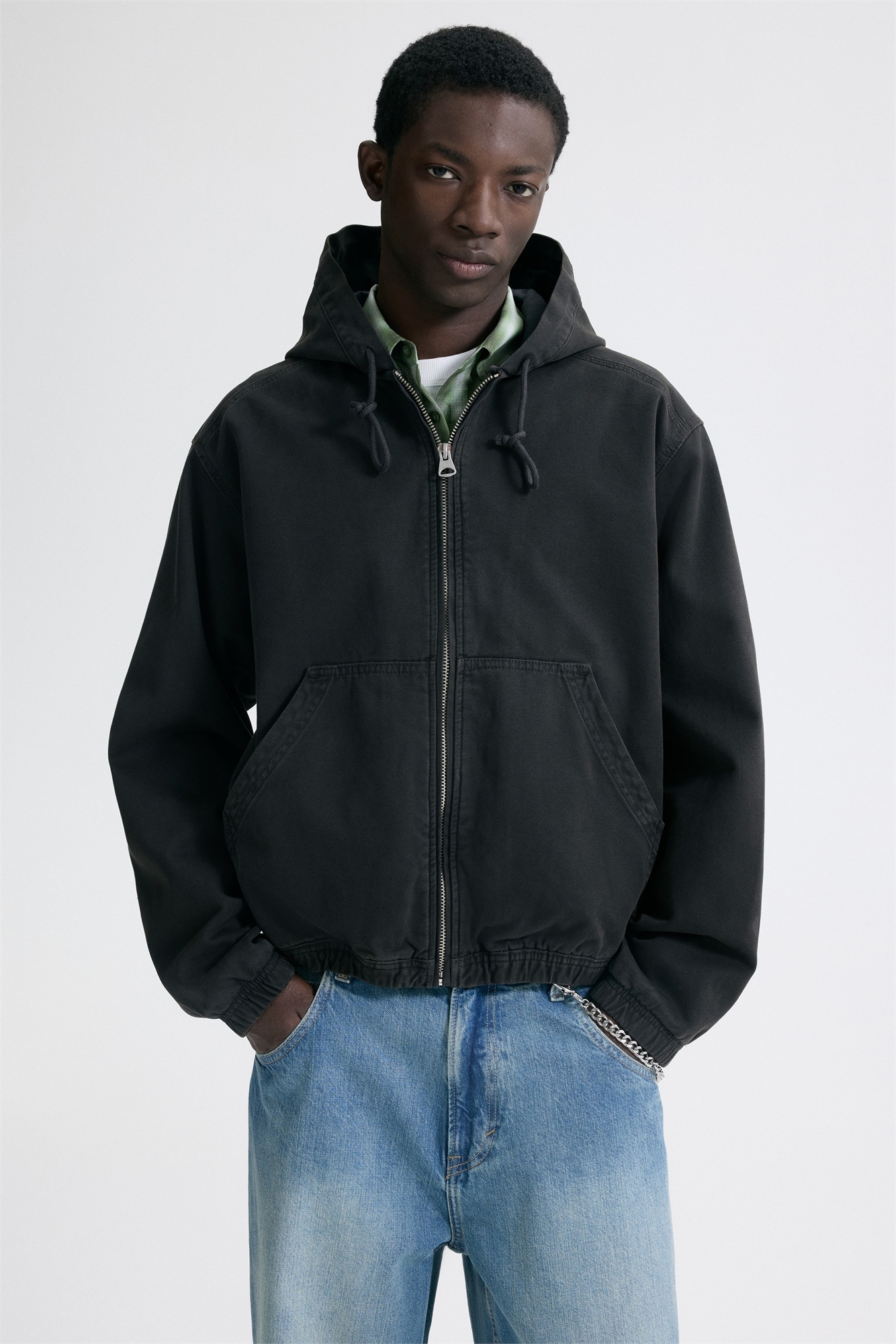 Рабочая куртка из хлопкового полотна с капюшоном на подкладке, застежкой-молнией спереди и ярмом сзади. Открытые карманы спереди и эластичные манжеты и подол.