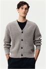 Кардиган из трикотажа в рубчик с глубоким V-образным вырезом, пуговицами спереди и длинными рукавами. Свободный крой для непринужденного, но не слишком большого силуэта.
