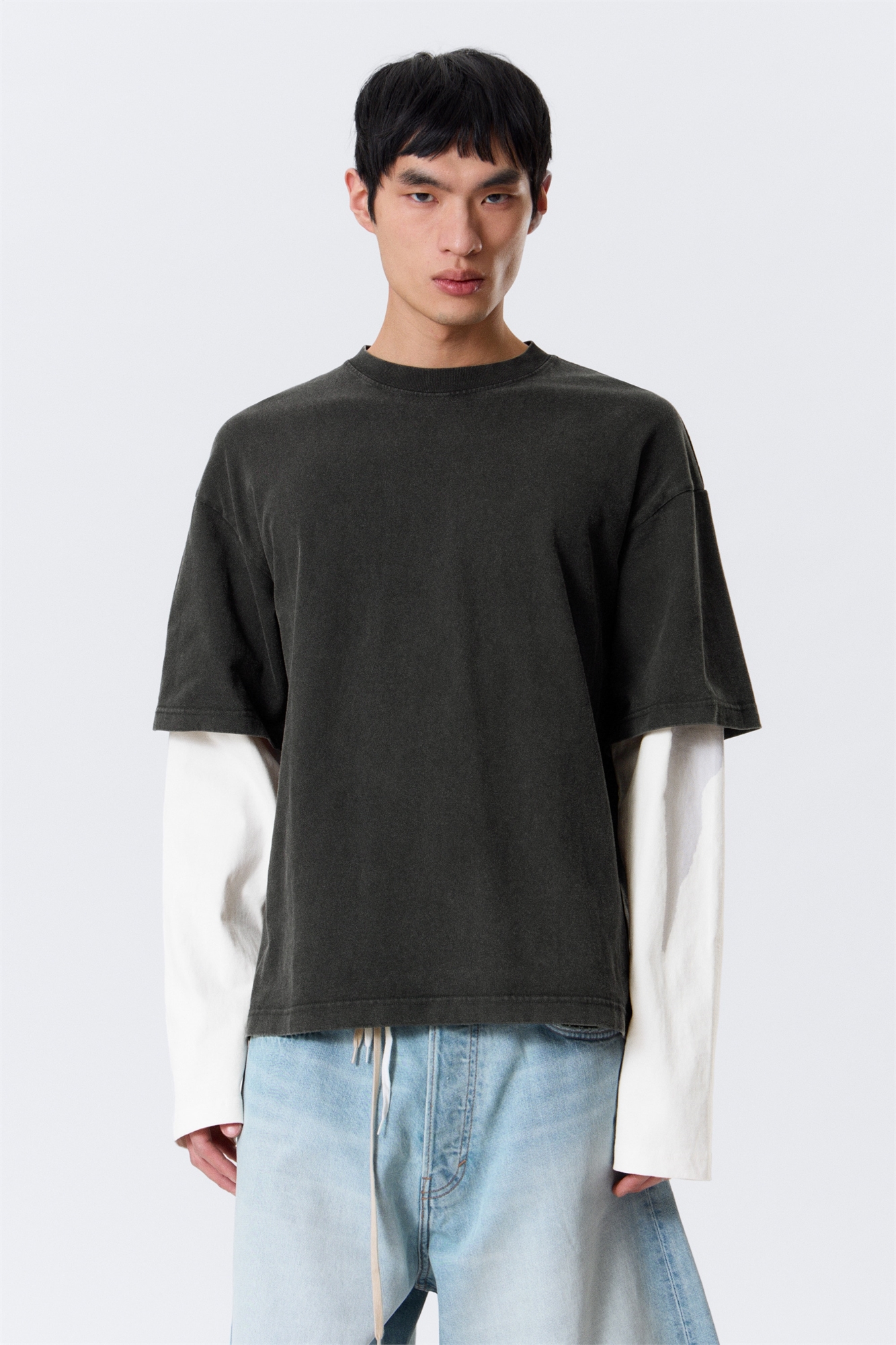 Футболка свободного кроя из хлопкового джерси с многослойным рисунком. Модель с короткими рукавами и длинными рукавами, ребристым вырезом горловины, деталями в виде цепочек на плечах и прошитыми двумя иглами каймами.