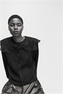 Кардиган из мягкого кабельного трикотажа с круглым вырезом и широким кружевным воротником. Застежка на пуговицы спереди и тесемки по вырезу, манжетам и подолу.