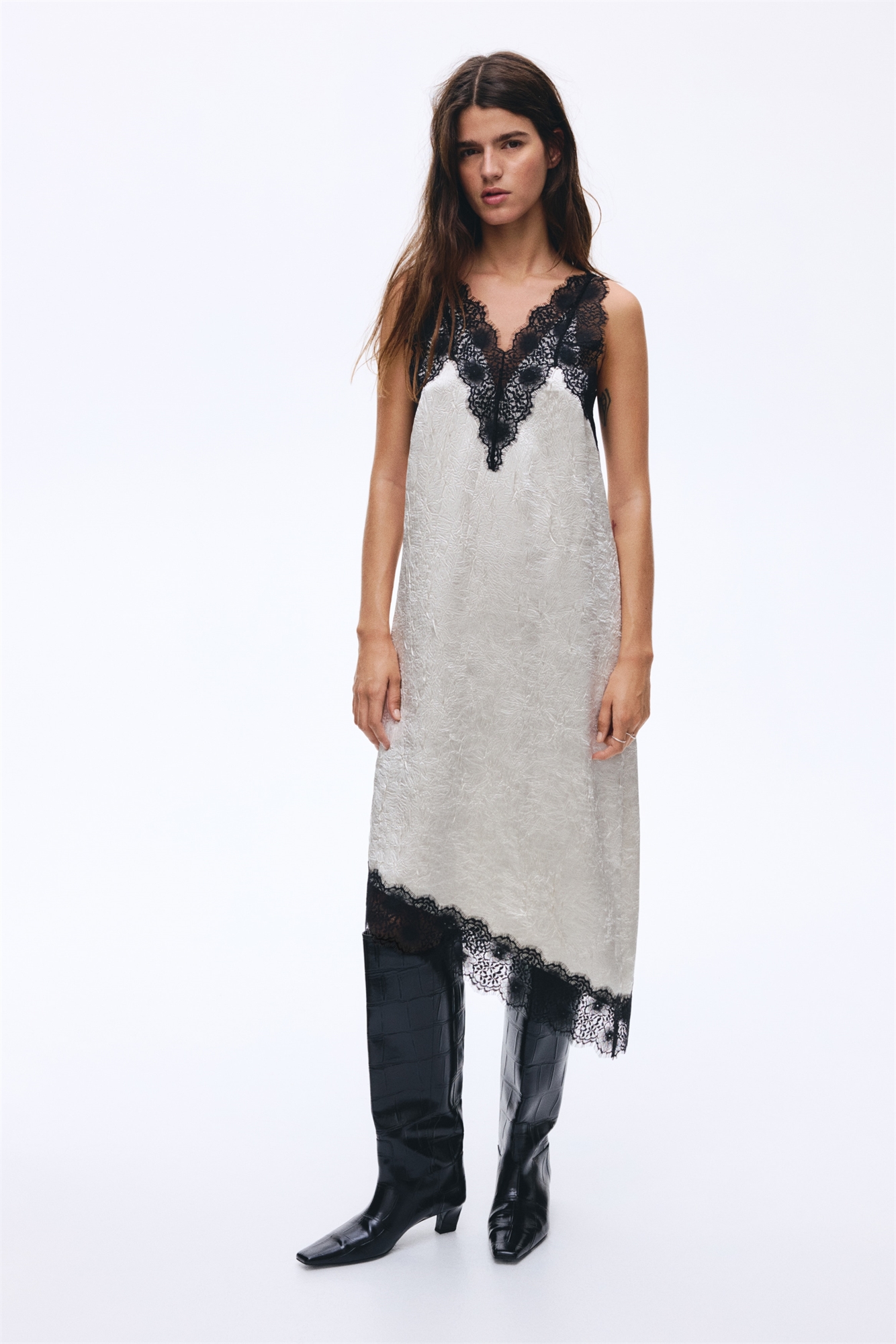 Платье длиной до колен свободного кроя из фактурной ткани с кружевом в верхней части и на подоле. Глубокий V-образный вырез спереди и сзади, широкие бретели и асимметричный подол. Без подкладки.