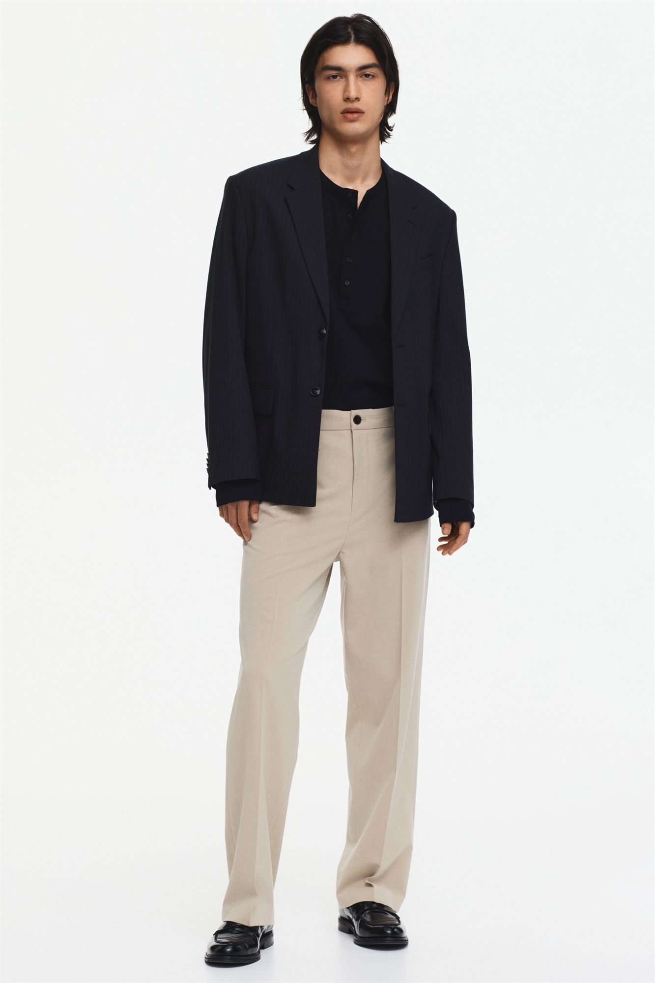 Брюки из тканого материала с ширинкой на молнии, пуговицей и закрытой эластичной резинкой с потайным шнурком на талии. Диагональные боковые карманы, втачные задние карманы на пуговице и ножки со складками. Свободный крой для непринужденного, но не чрезмерного силуэта.
