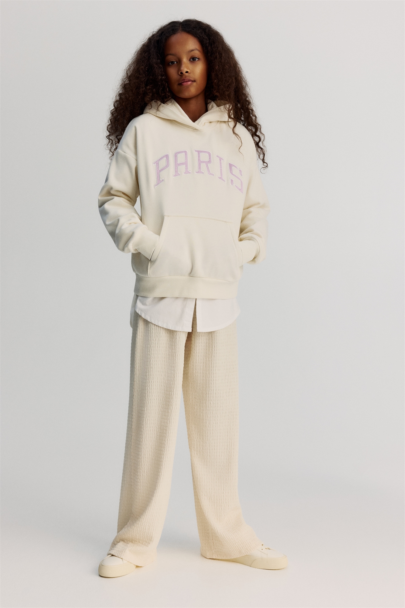 Толстовка свободного кроя из толстовочной ткани с мягкой начесом внутри и деталью из мотивов спереди. Капюшон на трикотажной подкладке, отворачивающийся спереди, с опущенными плечами и карманом-кенгуру. Длинные рукава, манжеты и подол отделаны тесемками.