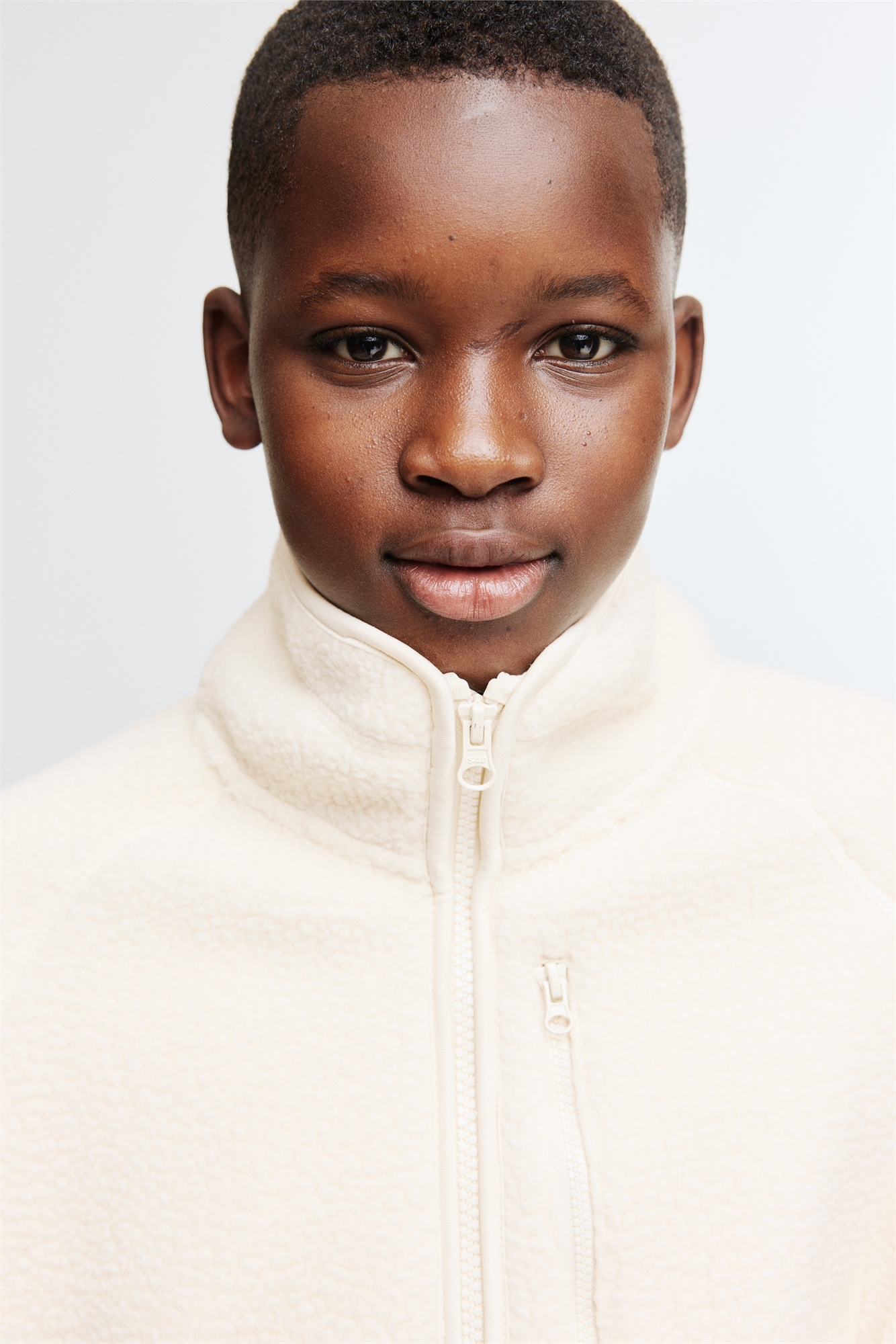 Куртка из мягкого плюша с трикотажной отделкой по краям. Воротник-стойка, застежка-молния спереди, защита подбородка от натирания, нагрудный карман на молнии и прорезные боковые карманы.