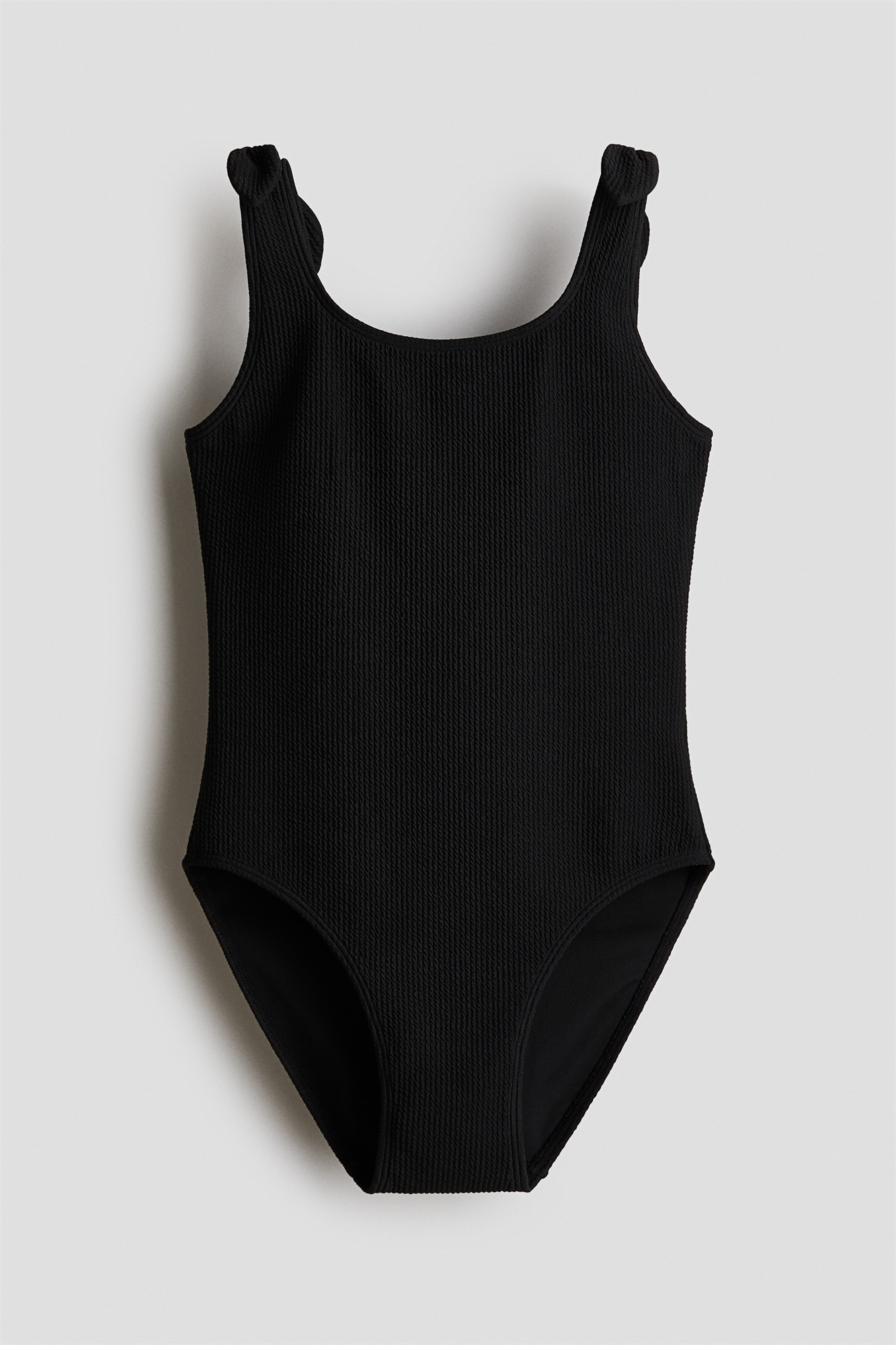 Полностью закрытый купальник из фактурной ткани с круглым вырезом и бретелями с узлами.