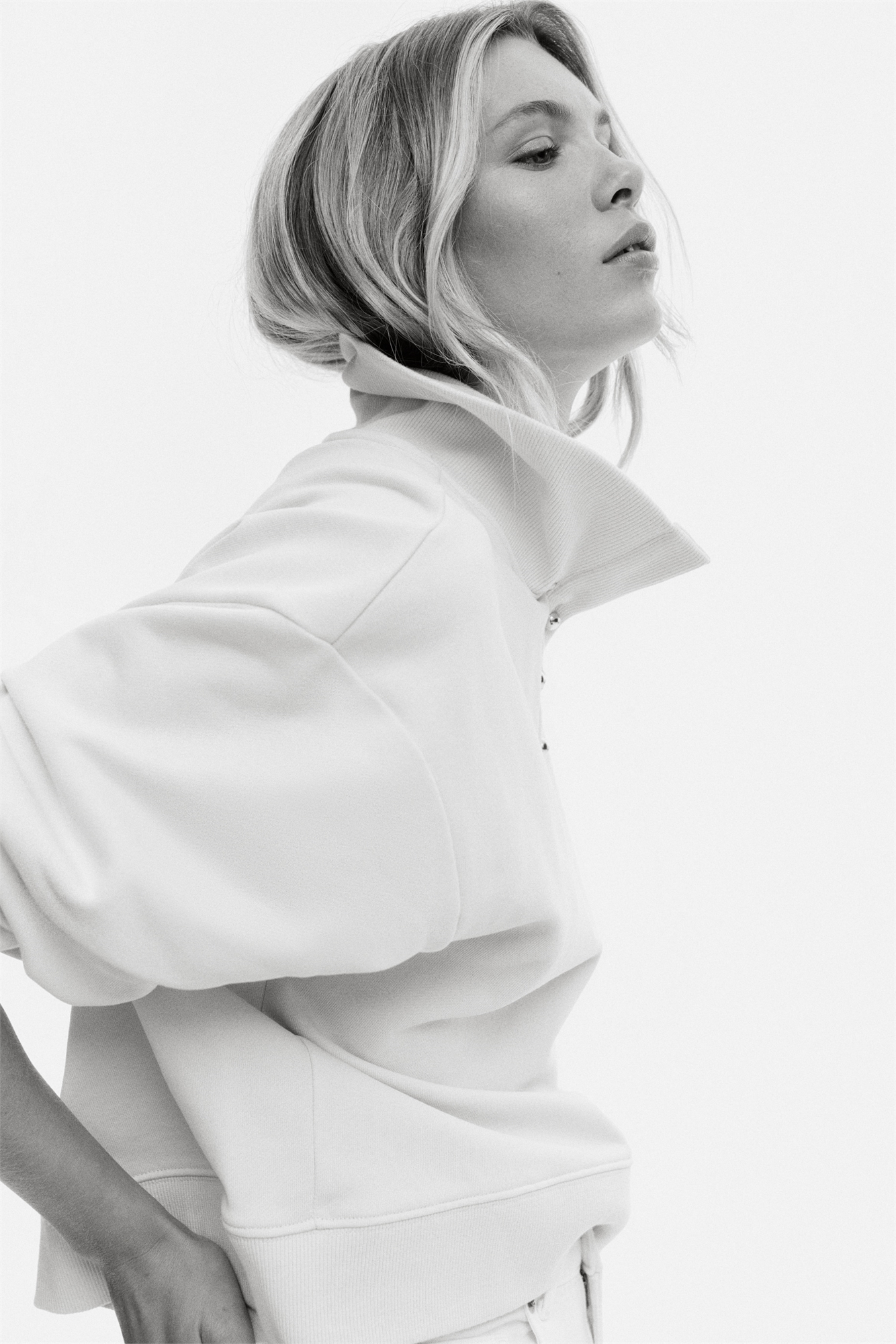 Свободный топ из легкой хлопковой ткани в виде толстовки с воротником и куполообразными металлическими пуговицами в верхней части. Спущенные плечи, длинные рукава, манжеты и подол в рубчик.