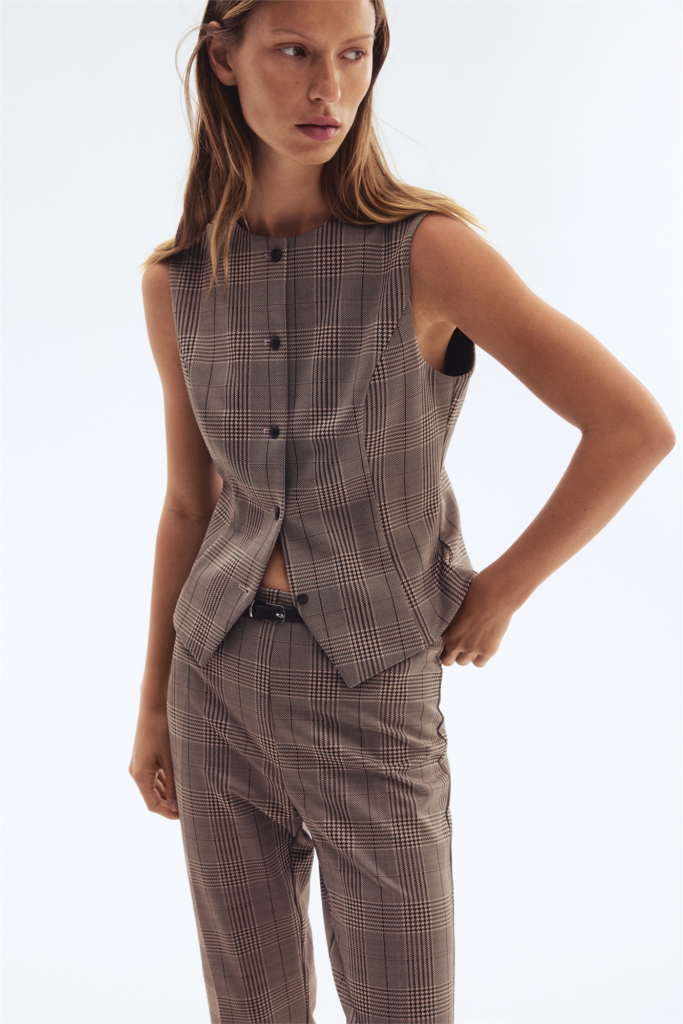 Короткая приталенная жилетка из джерси с круглым вырезом и пуговицами спереди.